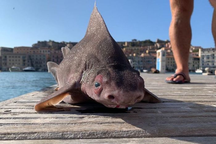 Причудливое глубоководное существо с телом акулы и мордой свиньи было вытащено из воды итальянскими морскими офицерами.