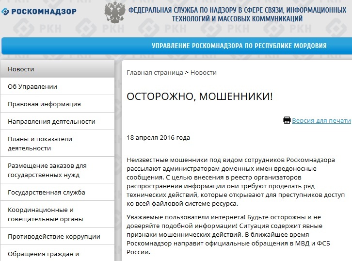 Как мы видим письмо отправлено якобы с официального почтового адреса Роскомнадзора: http://rkn.gov.ru/