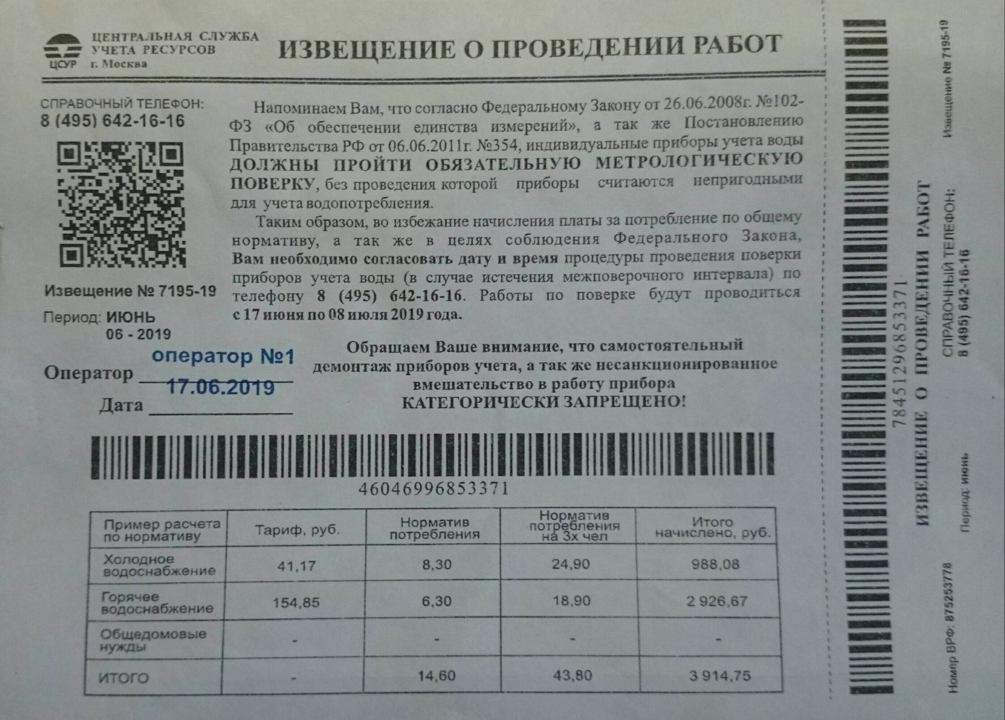 Часто приходят псевдоквиианции о смене приборов учёта На этот раз нам был выставлен счёт непонятно за что.(воду мы платим в общей квитанции по счётчикам) Ещё и с нормативом потребления на трёх человек. В квитанции не указан адрес. Значит они их бросают одинаковые для всех. Напечатанные на цветном принтере дата. (Якобы печать)