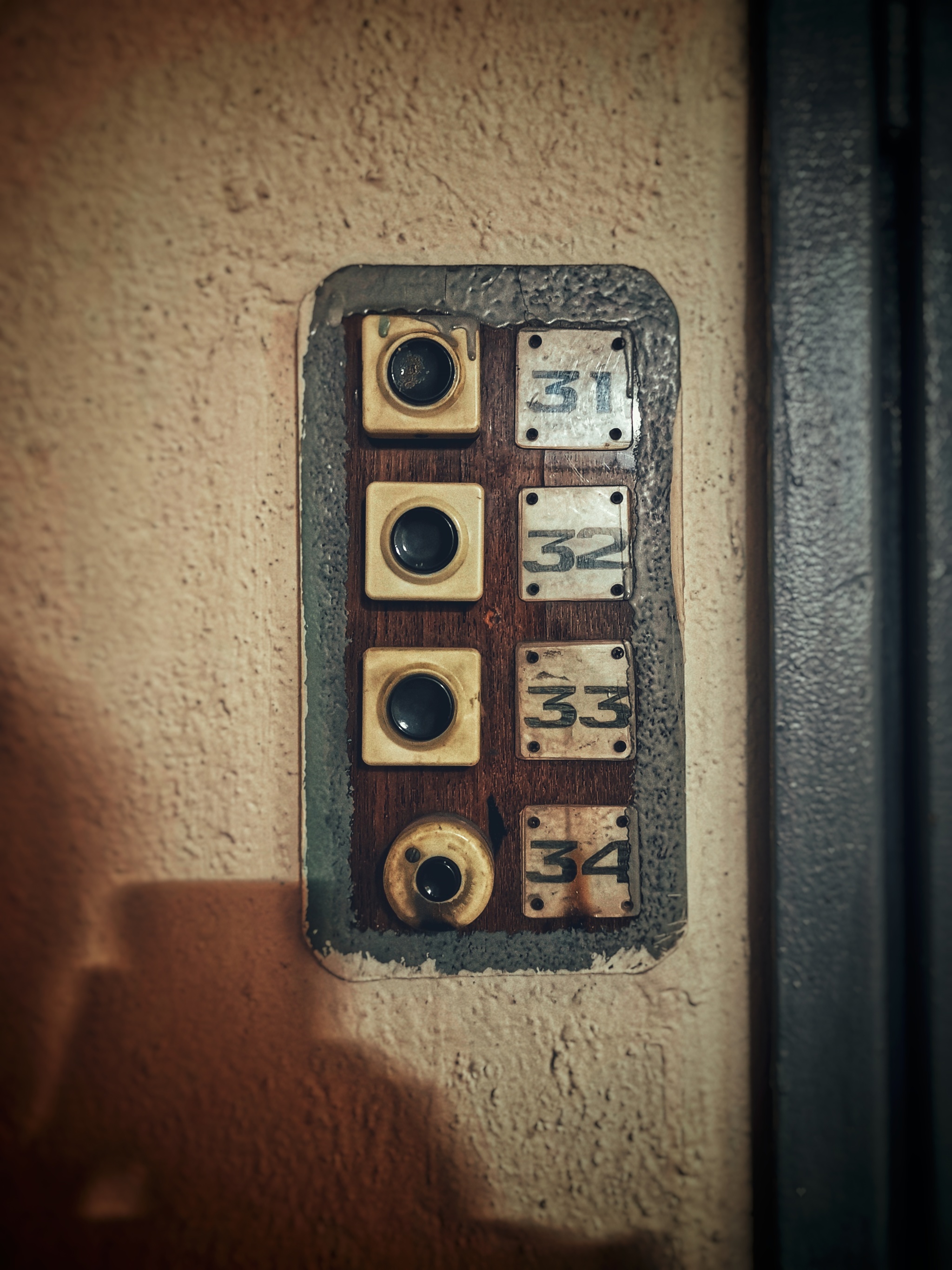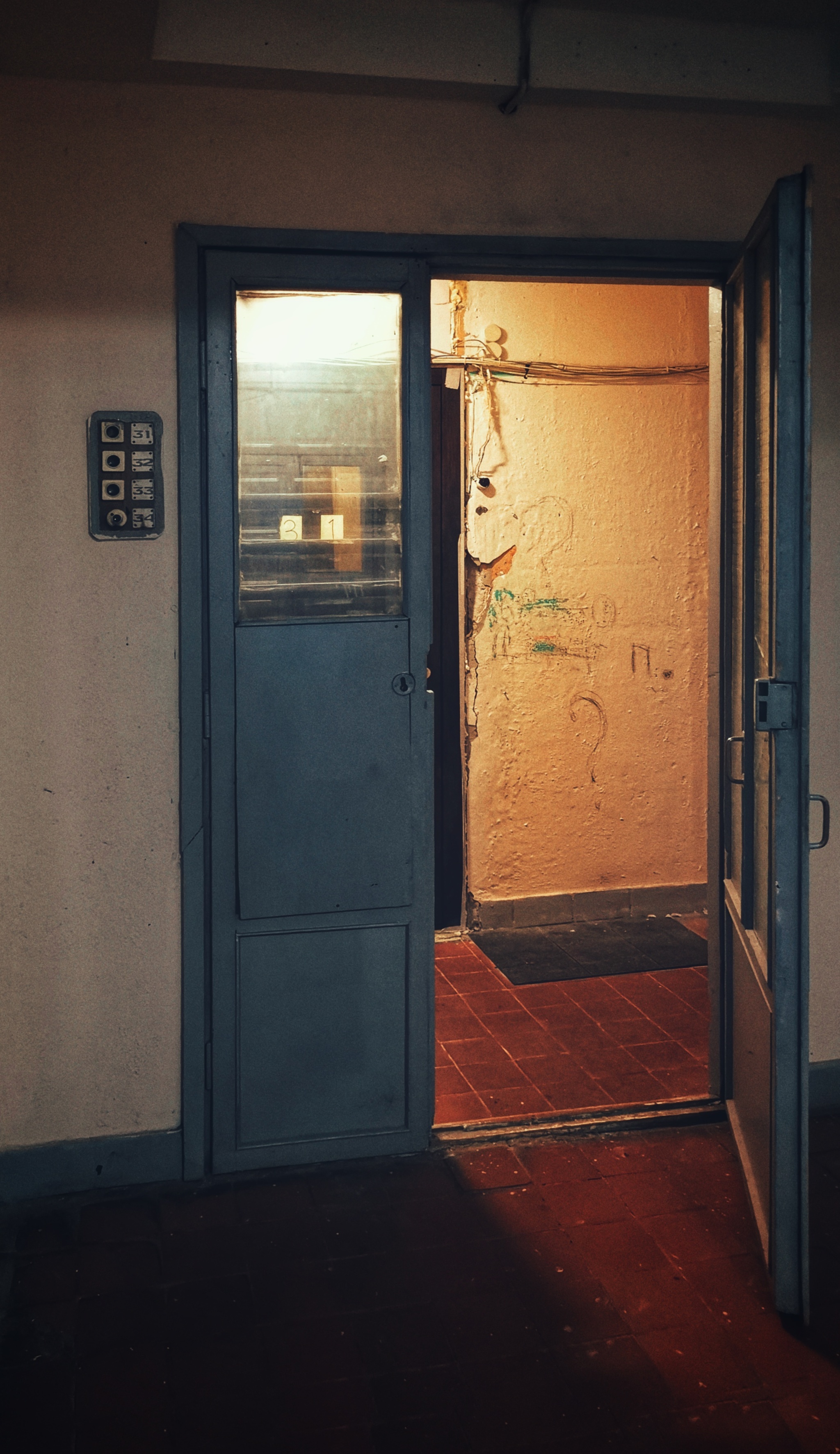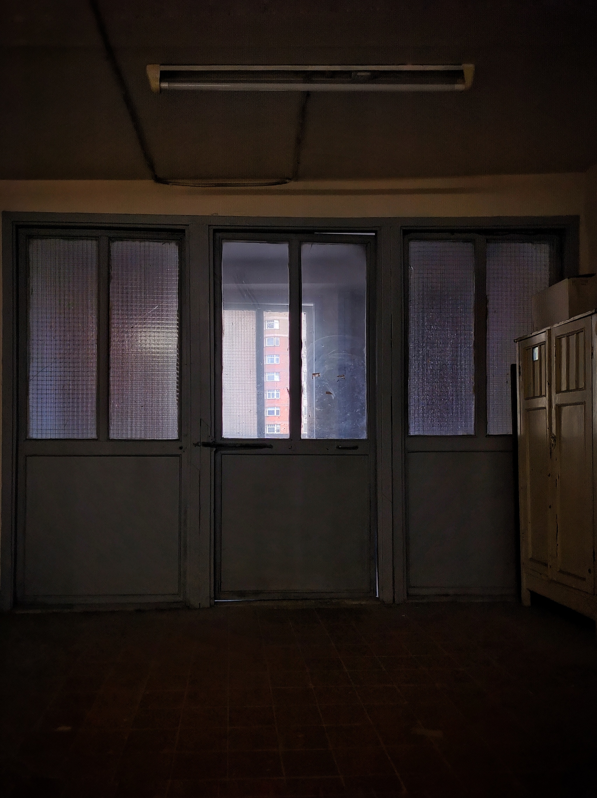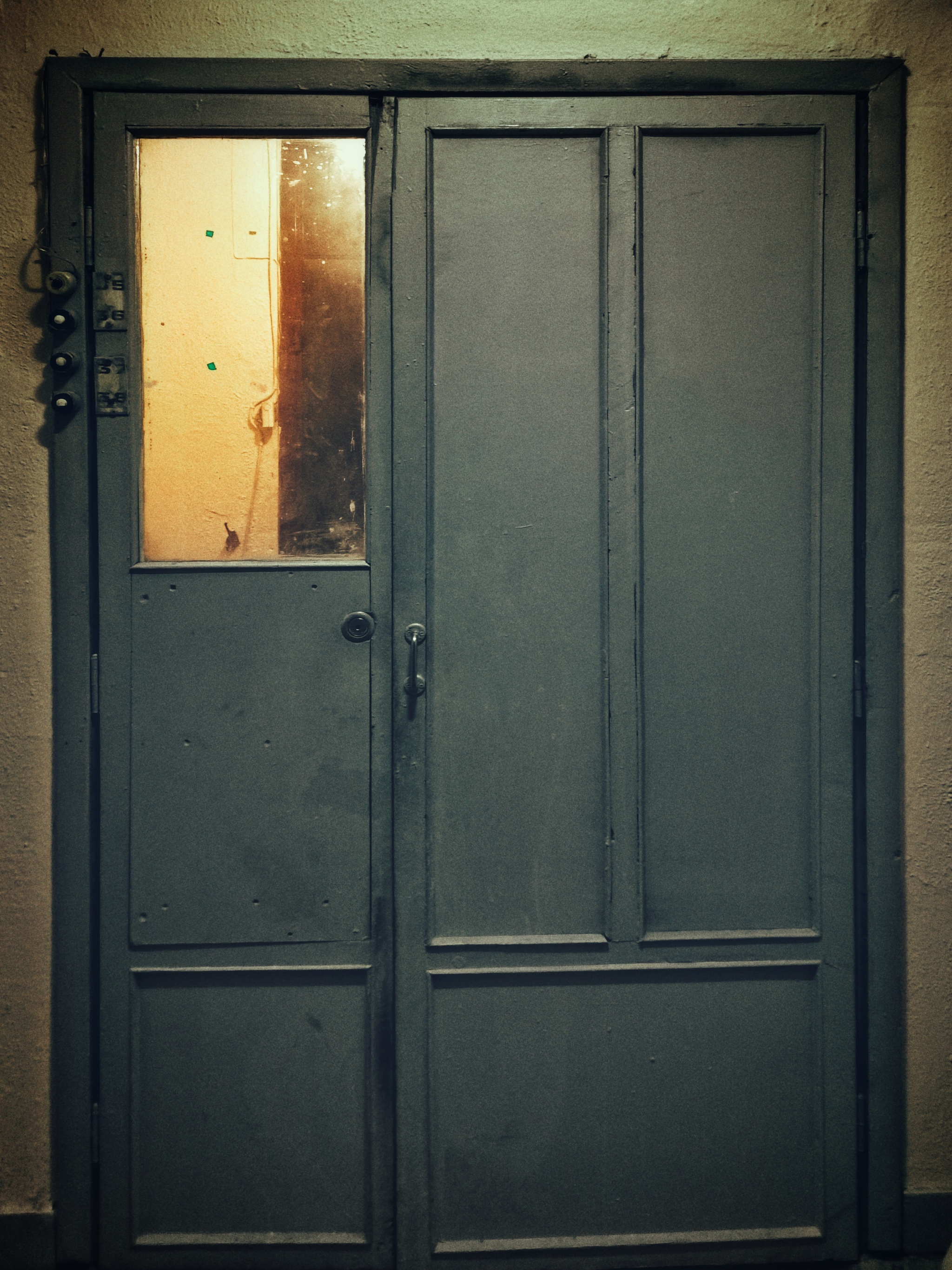 В основном жильцы их давно уже заменили на глухие железные двери с замками, но на одном из этажей, мне удалось найти оригинальные.