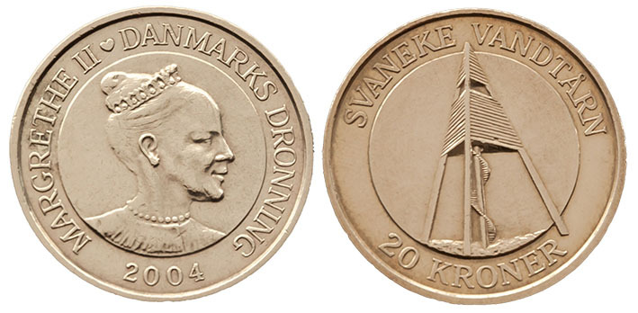 Монета 20 датских крон. 2004 год выпуска. 27 мм диаметр, алюминиевая бронза. 1,2 миллиона тираж. Монетный двор Копенгаген, Дания. ♥ - знак монетного двора Дании.