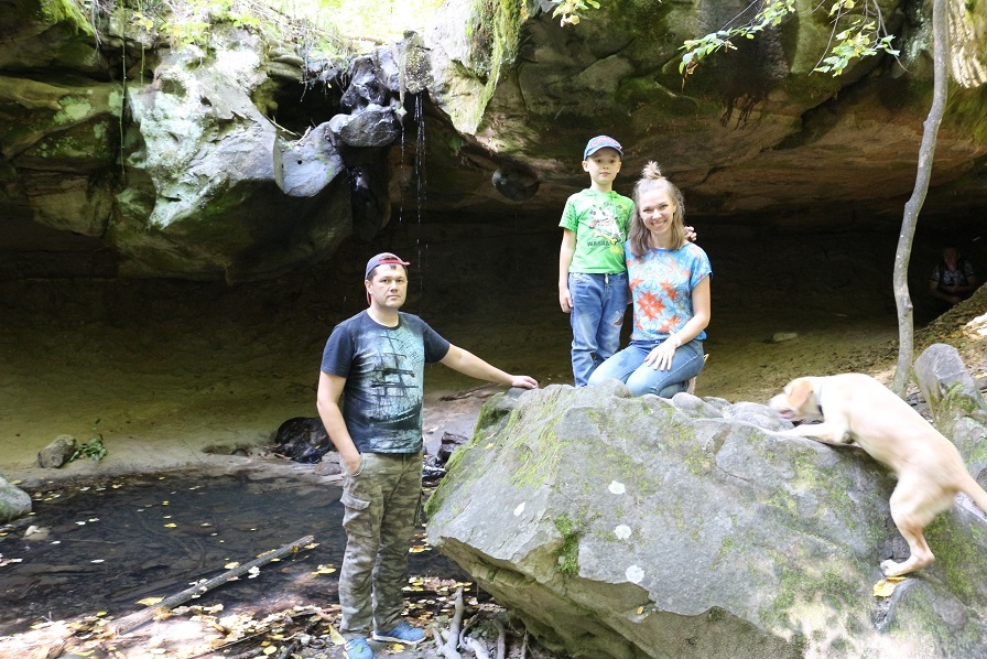 А сын не нудел) Взял фонарик и пролез насколько мог в пещеру под камнем. Сам водопад - это падающий с высоты около 8 метров ручей. В период многоводья он становится больше и вымывает песок и землю из-под громадной глыбы, расширяя и углубляя пещеру. Интересно, я такое раньше не видел!