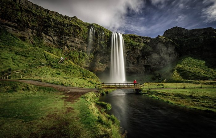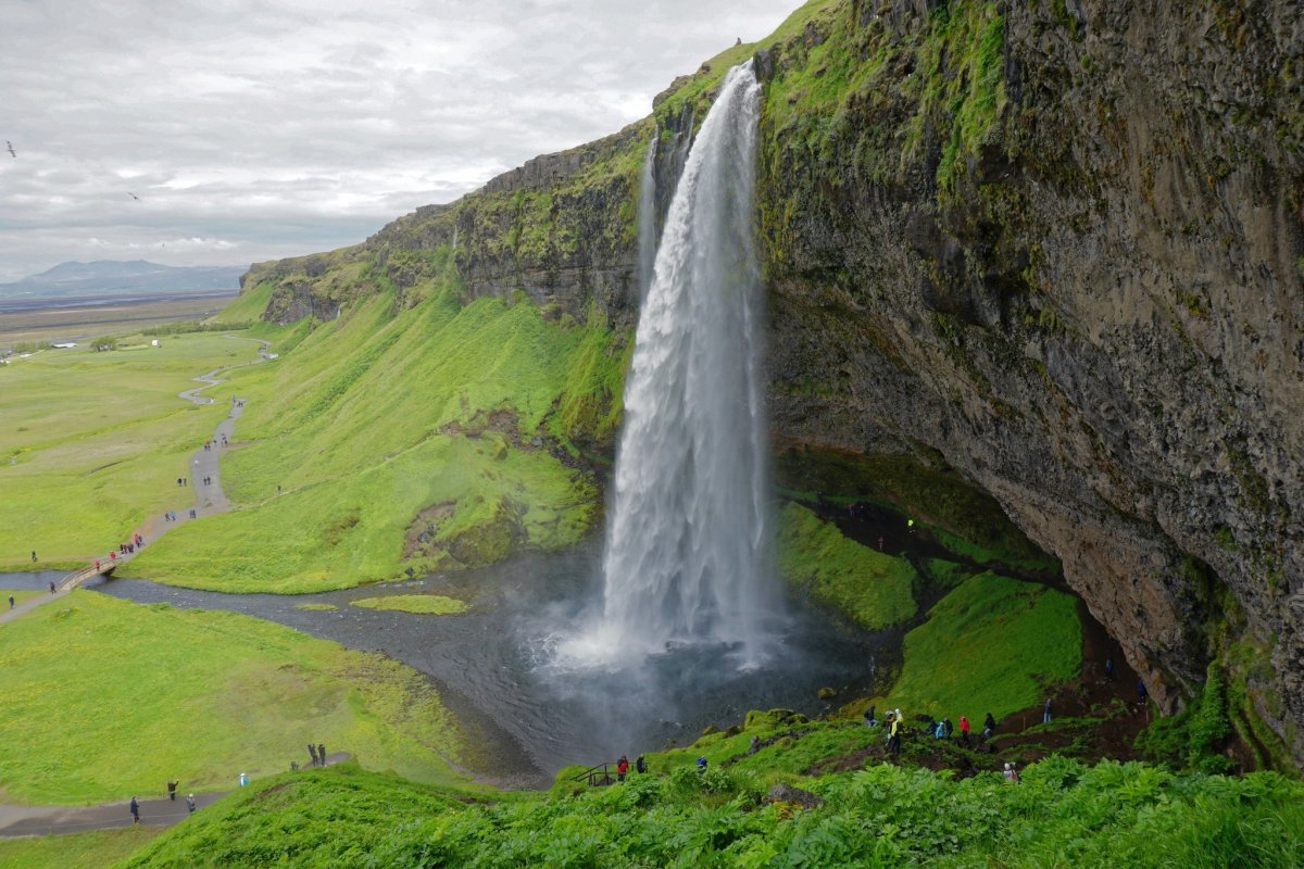 Прелесть этого водопада в окружении. Речная вода падает в небольшое озеро, которое образовало грот, — можно пройти сквозь неё и посмотреть на обратную сторону водопада, — это единственный подобный водопад Исландии. Хотя тропинка узкая и скользкая, она всё-таки достаточно безопасная и лёгкая для путешественников, ведёт снизу вверх, что позволяет любому туристу сделать фотографии, как с вершины водопада, так и у его подножья. Далее вода течёт по равнинной местности покрытой зеленью далеко за горизонт. Тут проходят почти все туристические тропы для любителей пройти по острову на своих двоих. Собственно, Исландия идеальная страна для длительных пеших туристических походов.