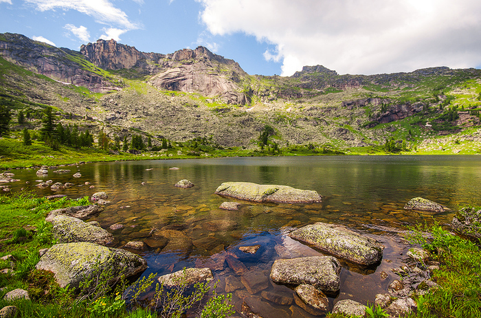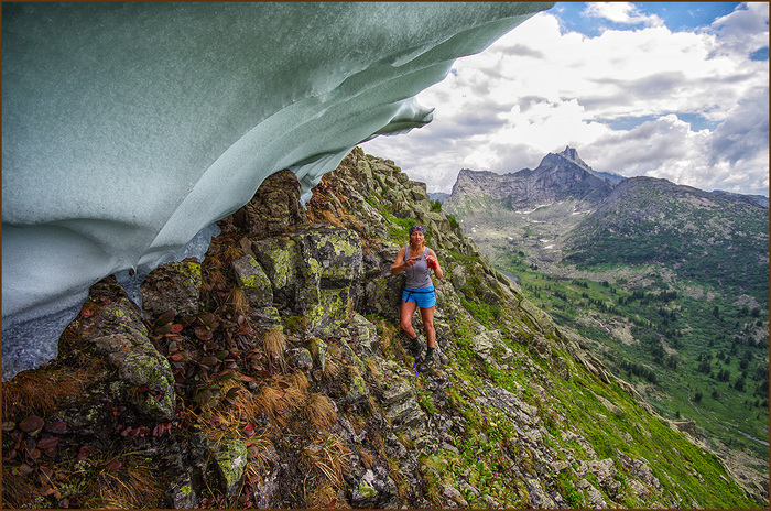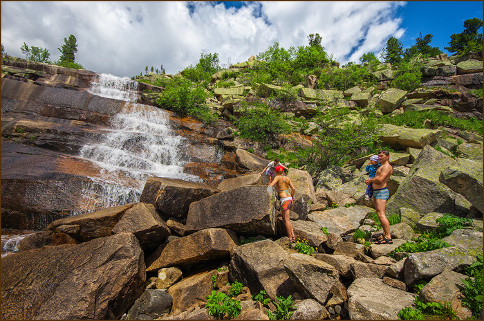 Популярный водопад Тушканчик находится в Ергаках, в долине озера Мраморное. Мы часто там бываем. Здесь расскажу про одну радиалку до водопада, от Радужного. Мы отправились напрямик, через перевал Домой. Вещи оставили в палатках, с собой взяли только маленькие штурмовые рюкзачки, перекус, фотоаппаратуру.