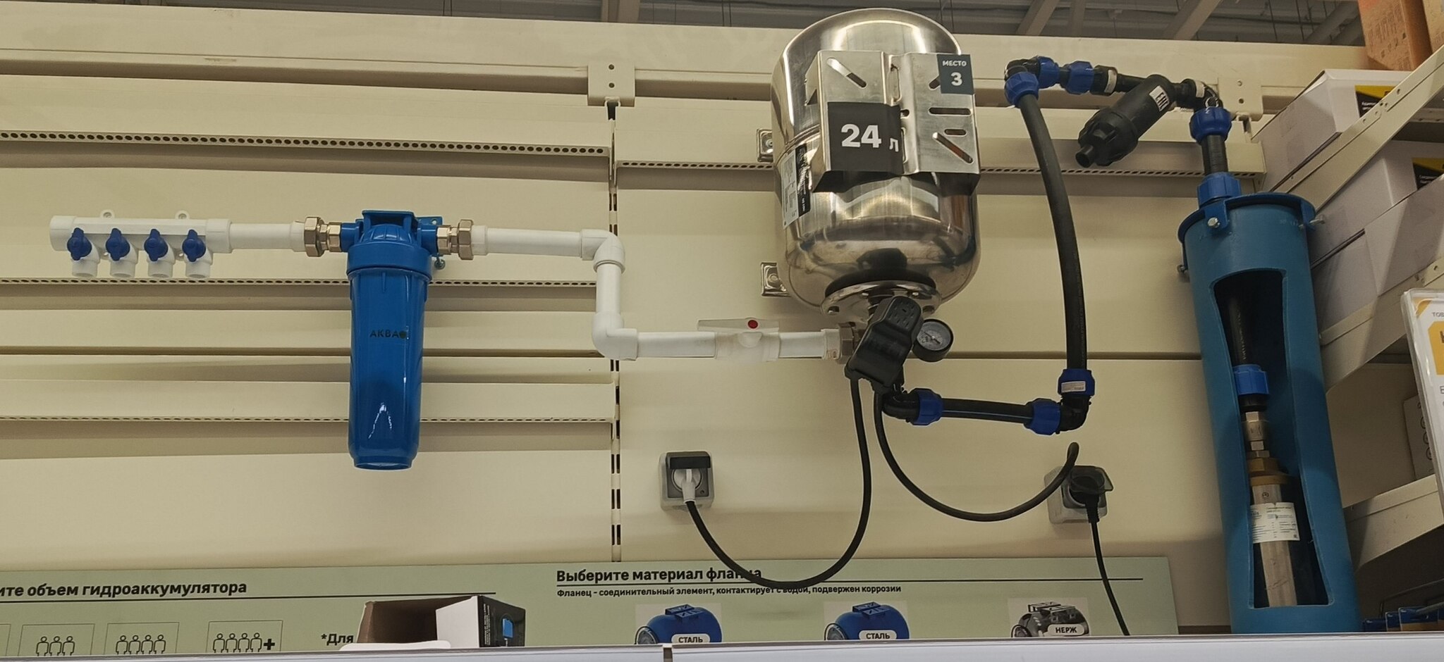 - Далее гидроаккумулятор. Заявлено, что при установке частотника он почти не нужен. И вот тут наступает критический момент - электроснабжение. Если бывают хоть какие-то перебои с электричеством, то без гидроаккумулятора большого объёма никуда.