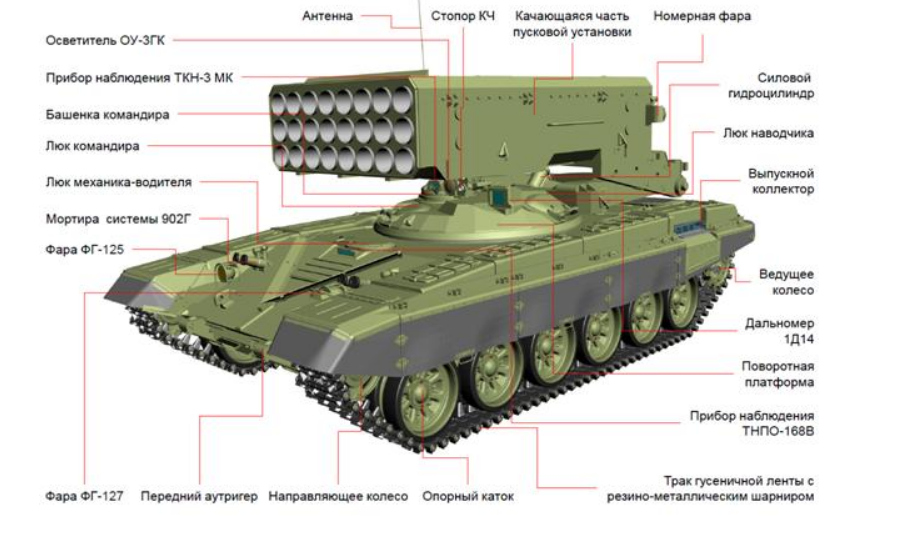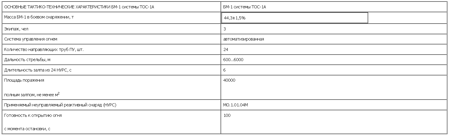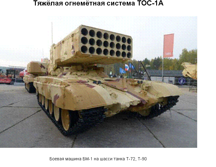 БОЕВАЯ МАШИНА БМ-1 представляет собой реактивную систему залпового огня (РСЗО) на танковом шасси для стрельбы неуправляемыми реактивными снарядами (НУРС) и обеспечивает уничтожение живой силы противника на открытой местности, в фортификационных сооружениях, вывод из строя легкобронированной техники, поджог и разрушение сооружений, высокотемпературным полем и избыточным давлением, создаваемым залпом НУРС в термобарическом снаряжении.