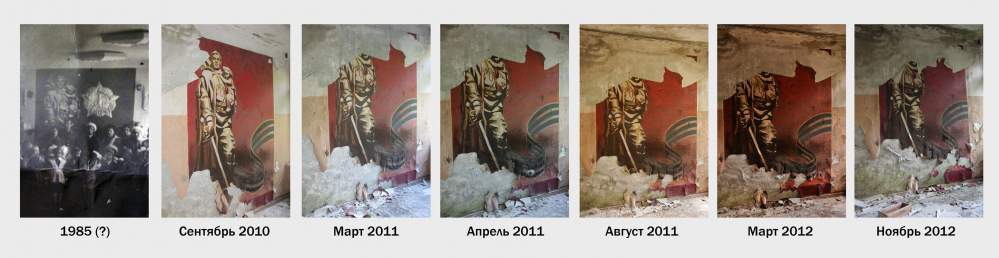 На фотографиях ниже видно как время влияет на состояние фресок, что нарисованы на стенах средней школы.