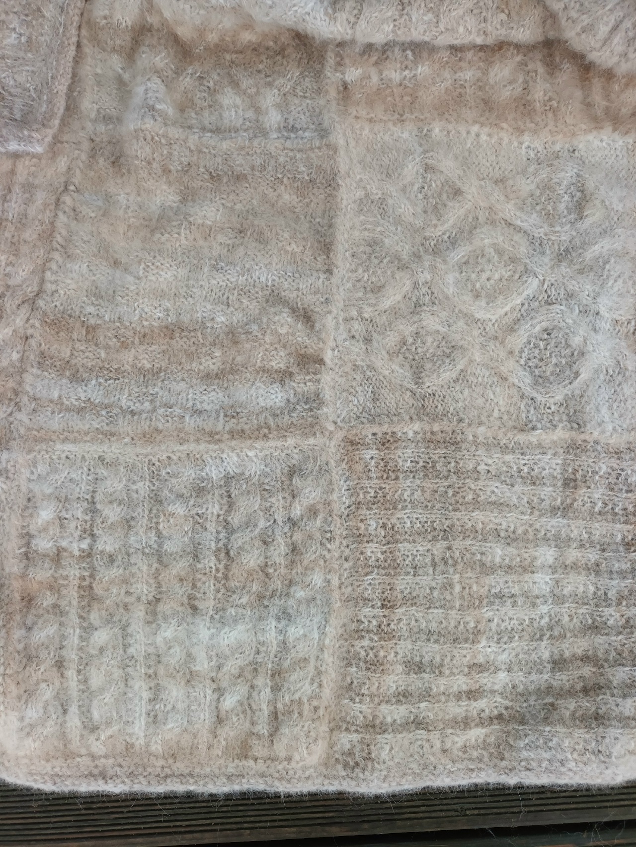 Немножко подробностей. Плед связан по дизайну 124-3 от Drops. Состоит из 4-х типов квадратов, сшитых хаотично и в разных направлениях.