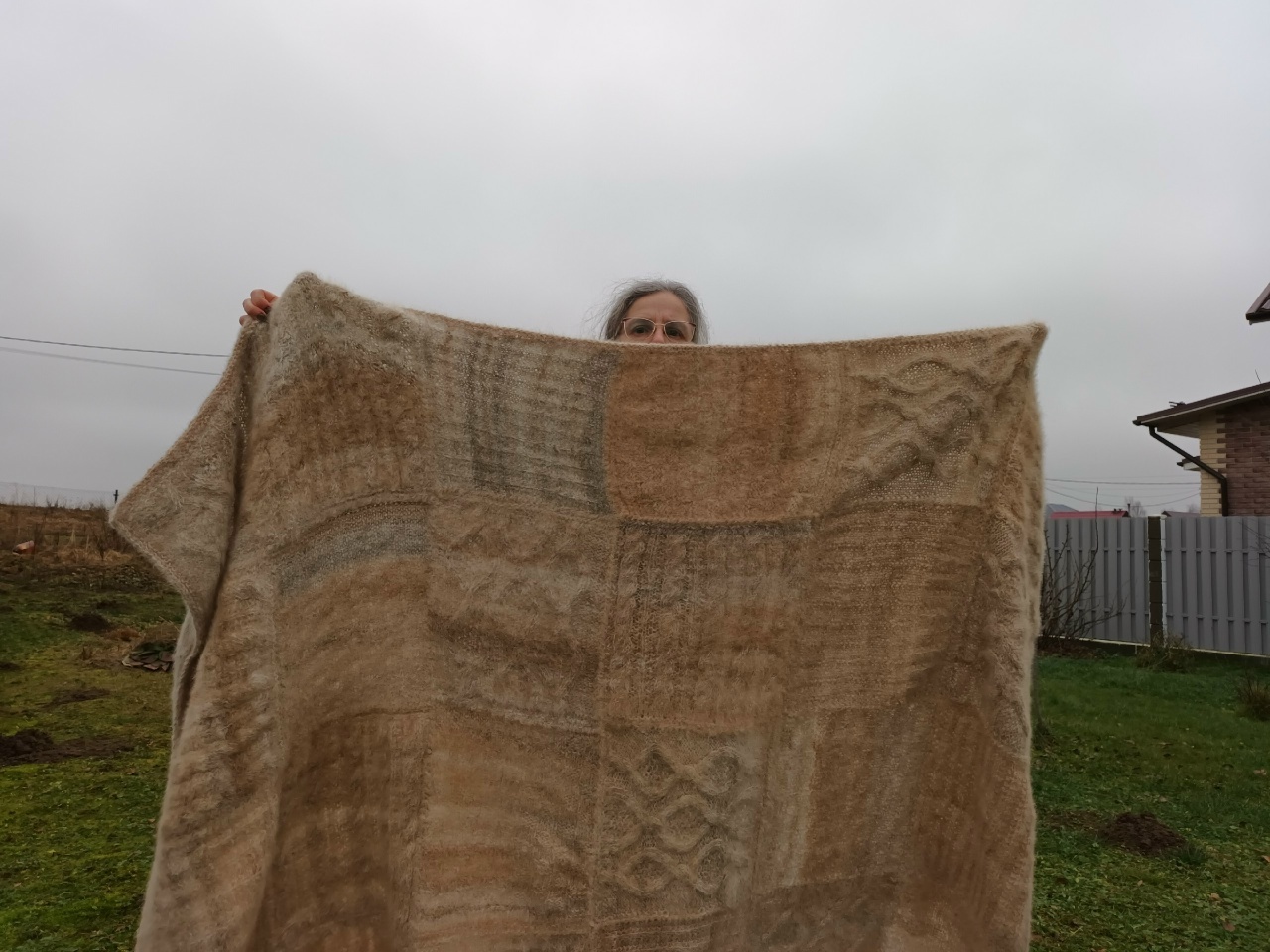 Вес пледа 1750 г, для этого пришлось переработать около 2300 г шерсти. Спрядено без основы, так что это чистая собачья шерсть.