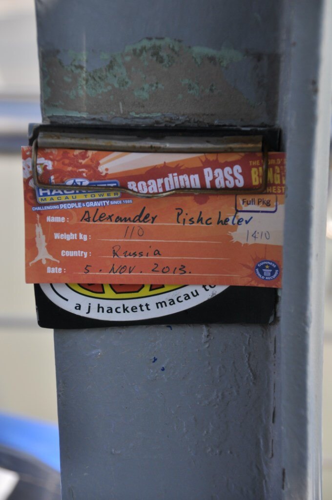 При выходе из лифта стоит стойка с регистрацией для участия в банджи. Идти на регистрацию сразу не обязательно, можно походить по стеклянному полу на высоте 233м. посмотреть прекрасную панораму на Макао, да и просто привыкнуть к высоте. Хотя кого я обманываю, к такой высоте привыкнуть просто не реально. Ну что, фотки сделаны, идем на регистрацию, там Вас попросят подписать что Вы полностью здоровы, не находитесь в алкогольном (а как без него вообще прыгать?!?))) и наркотическом опьянение, и что меня больше всего напугало, за разрыв сердца в полете, они ответственность не несут. Ставлю подпись, дату, попутно спрашивая были ли опасные случаи на производстве, получая отрицательный ответ, немножко выдыхаю. Мне выдали майку и ключики от шкафчика, где можно оставить личные вещи. Так же можно попросить комбинезон и обувь если ваша одежда не позволяет вам совершить комфортный прыжок. После всех переодеваний меня взвесили (для установки длинны резинки) и передали в руки обвязывальщиков.