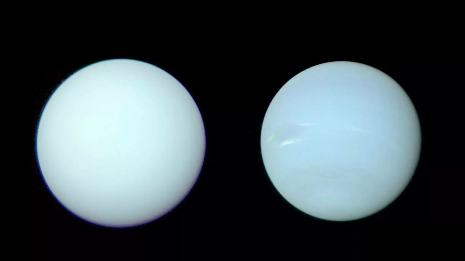 «Настоящие» цветные изображения показывают предполагаемые истинные оттенки двух планет Солнечной системы. Уран находится слева, а Нептун справа.