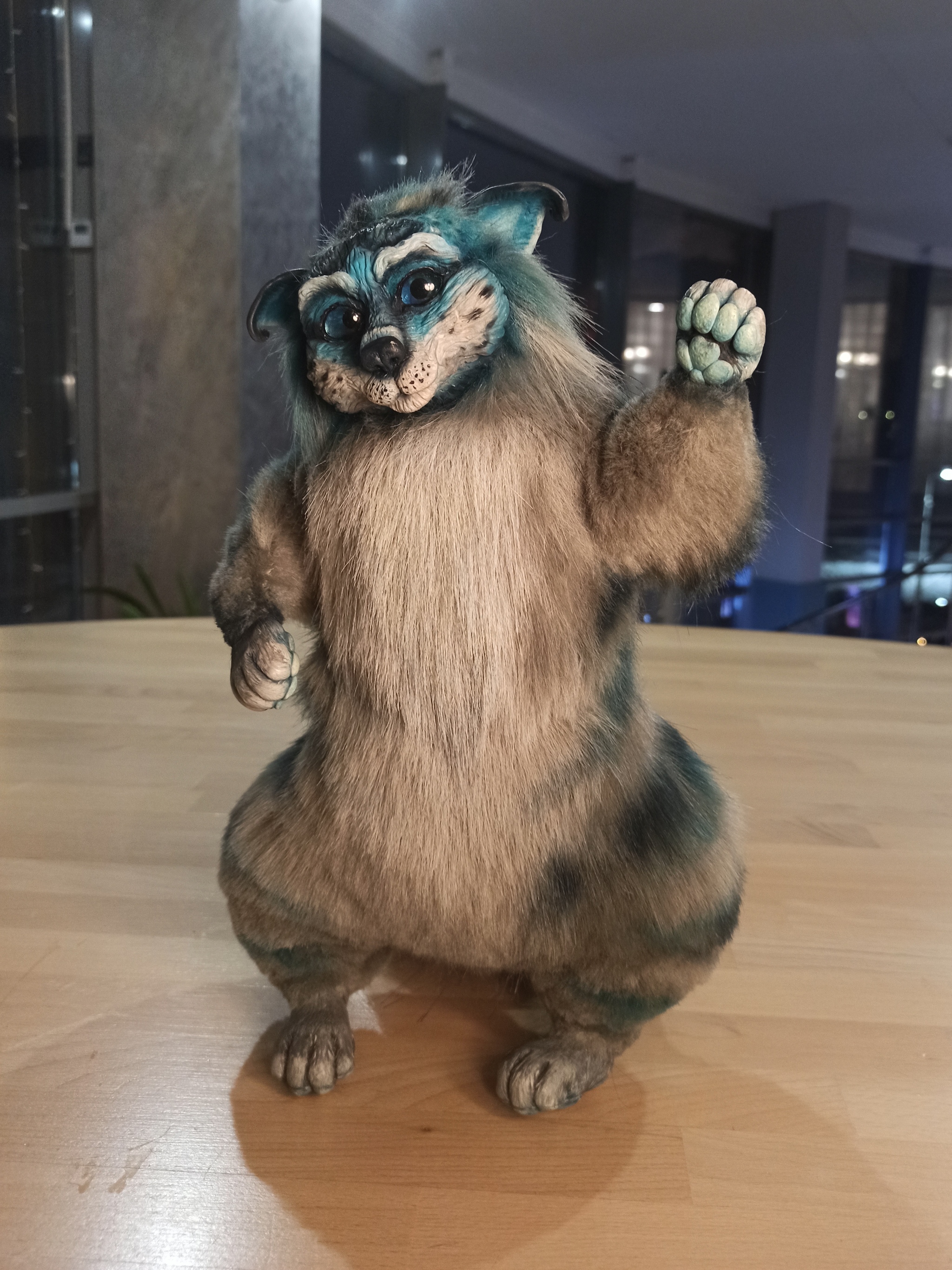 Материалы: искусственный мех песец, проволока, синтепон, нитки, полимерная глина, пастель и акрил, глазки стекло, расписаны вручную.