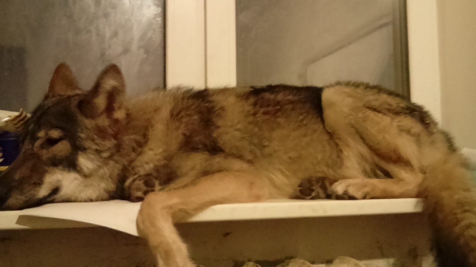 Предположительно волком была мать. Прошлый хозяин так сказал, а там кто его знает... надо экспертизу делать чтобы точно узнать. Характер не собачий. Хотя ласковая, абсолютно не агрессивная, поддается дрессировке, но хитрая и просто за спасибо попу от лежака не оторвет. Живет вместе с немецкой овчаркой, тоже сукой. Они прекрасно ладят друг с другом, блошат друг друга и даже иногда вместе спят. Но еда всегда порознь, а то овчарка может отнять еду у щенка.