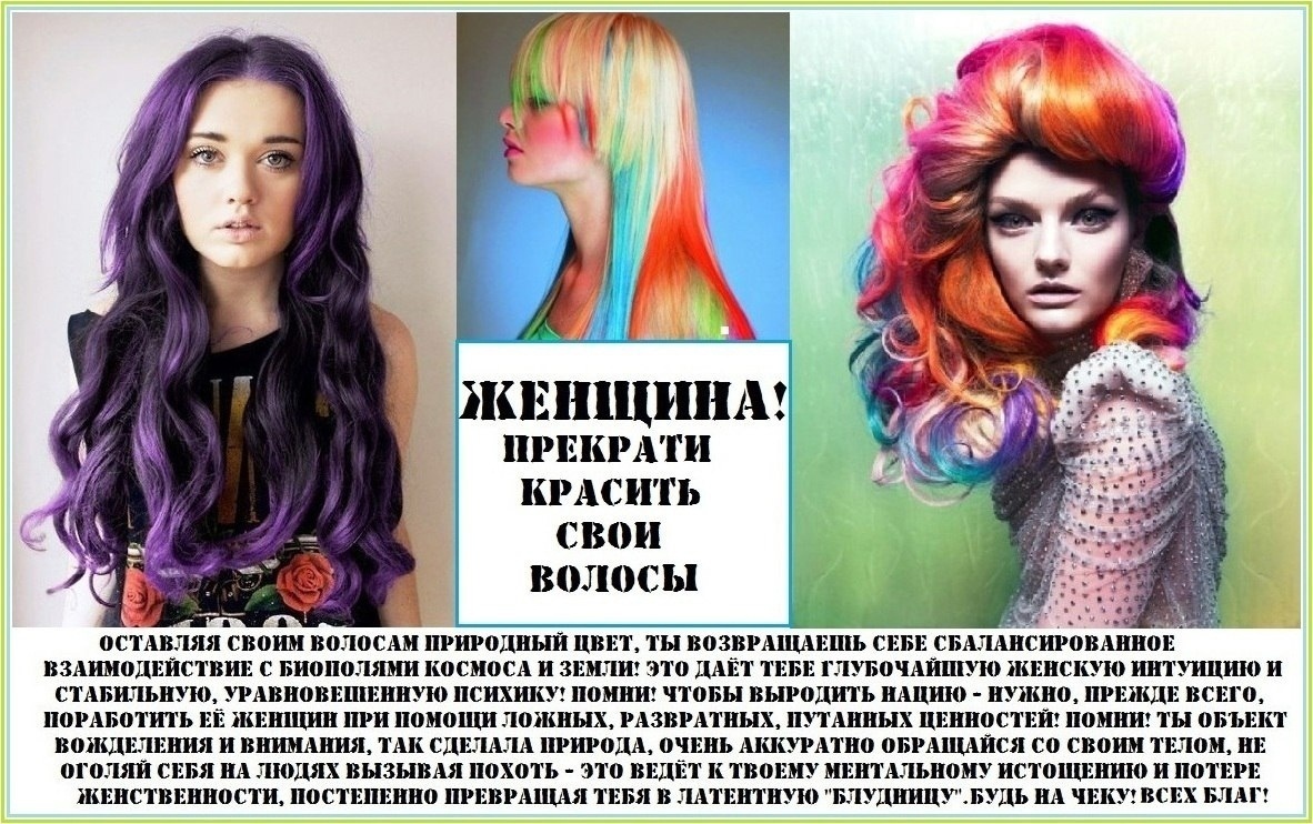 ...именно поэтому крашеные брюнетки - стервозны и истеричны (они поглощают всю энергию Света, в том числе и ненужную, приобретая избыточность)..., а крашеные блондинки - безтолковы и ненаиграно глупы (они отталкивают весь спектр Разумных Сил Света, в том числе и нужные ДухоТелу)... молоденькая девушка, ещё не накопив необходимых природных ресурсов (знаний, как хотите), обладая прекрасными русыми или каштановыми волосами, красит их в белый цвет, тем самым перекрывая природный,естественный регулятор энергоинформатики...все волны начинают отражаться от её неокрепшей головки...всё закономерно и природу нельзя перекрывать...