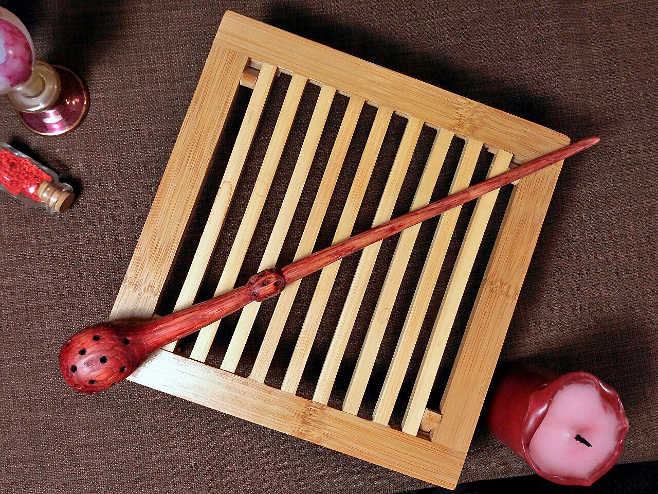 А глубоко в одном из этих отверстий — сердцевина. Лисья шерсть. Для этой палочки я использовал именно такую сердцевину, чтобы подчеркнуть лёгкость и даже некоторую вертлявость этой палочки.