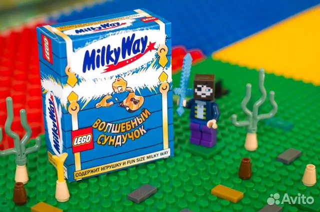 На Авито увидел интересный вариант Волшебного сундучка, который выглядит почти как оригинальный: отрисован с настоящей упаковки и распечатан на фотобумаге. Внутри лежит батончик Milky Way и набор конструктора (не LEGO).