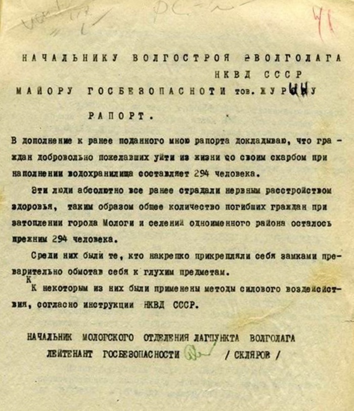 По поводу гибели 294-ех людей при затоплении Мологи имеются серьезные сомнения. Все опубликованные материалы ссылаются на один основной источник – рапорт лейтенанта НКВД – Скляров. Иных серьезных доказательств не найдено.