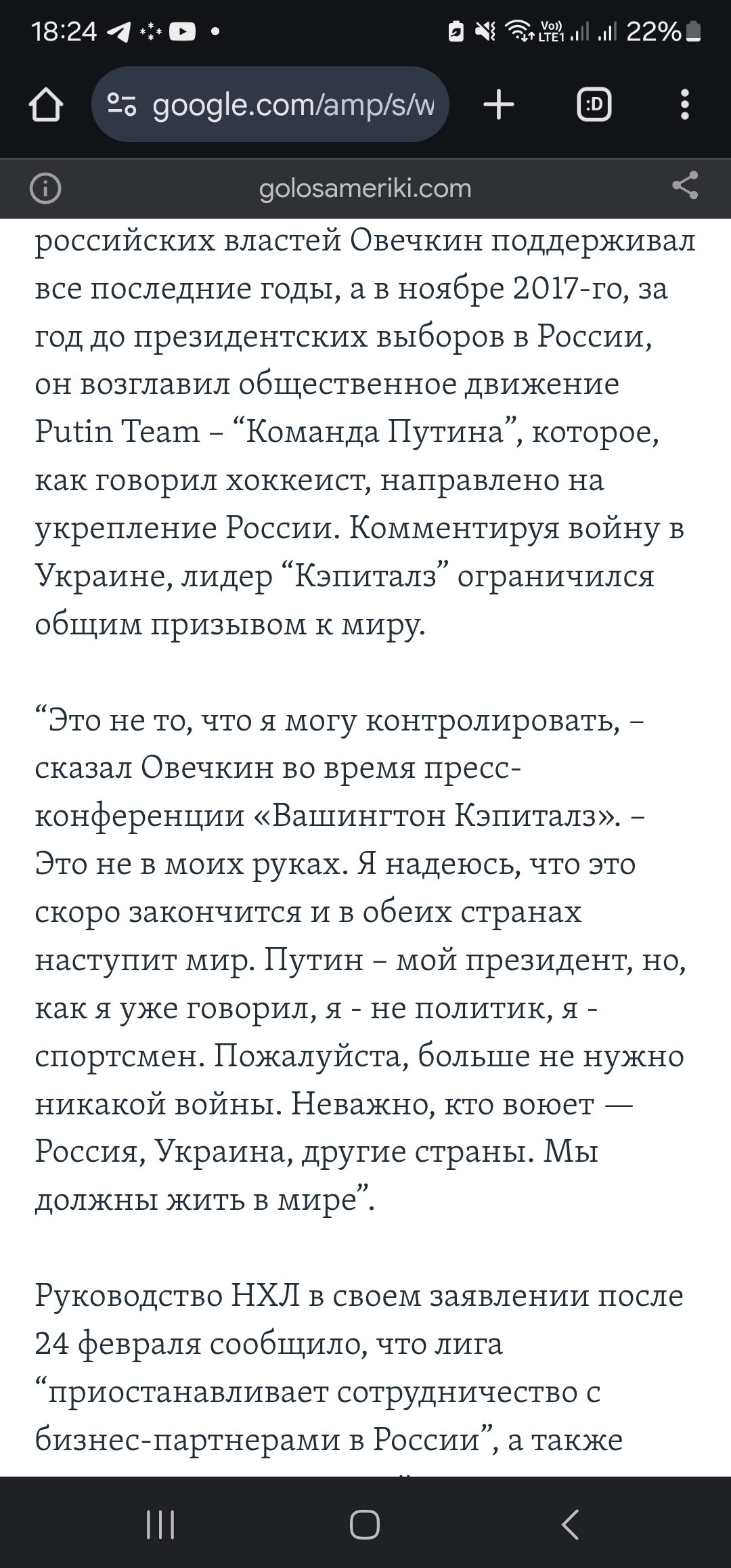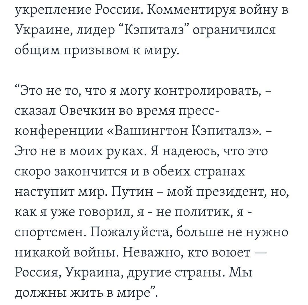 Овечкин, хоть и не осудил СВО, но и в поддержку не выступал, занял вполне адекватную, нейтральную позицию, призвав к миру.