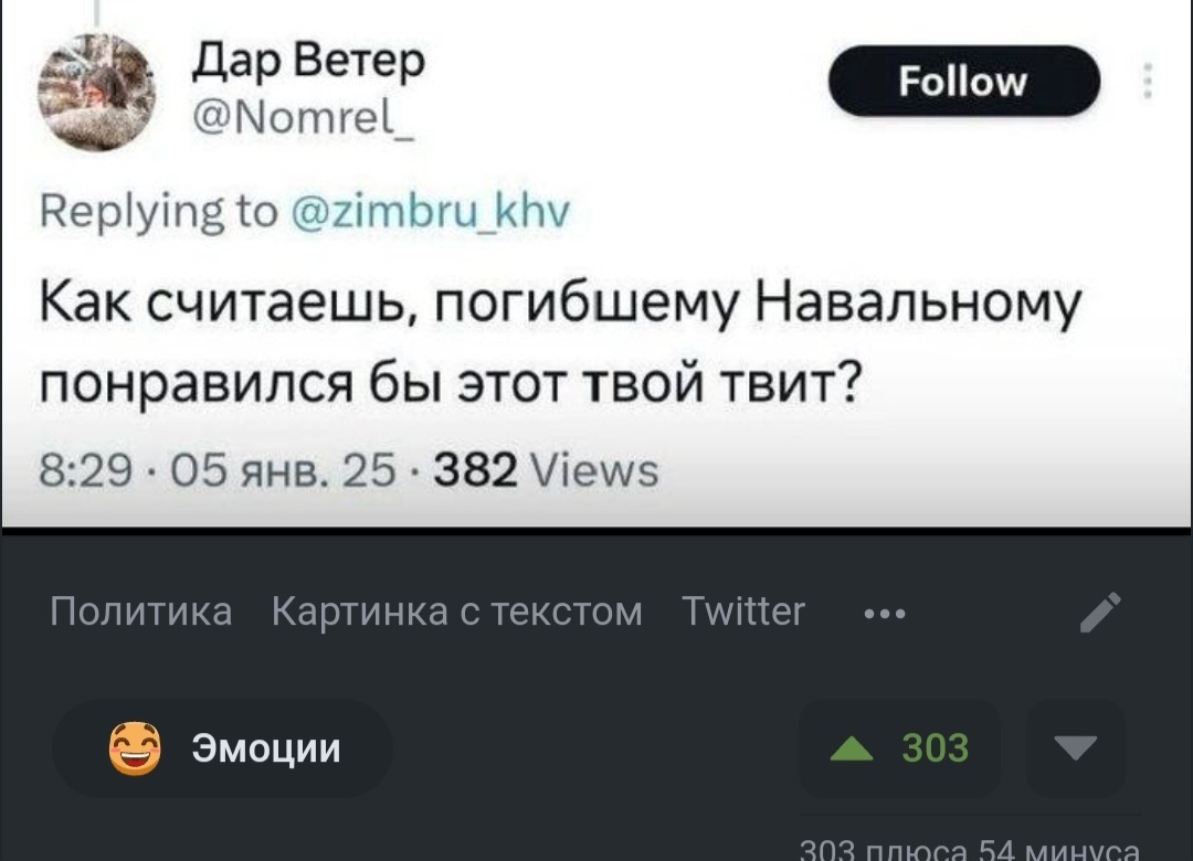 А что бы сказал Навальный, если бы узнал, что этот новорег считает, что хуже шутки про него получается ток шутки про мать в канаве...довольно обидное сравнение🥲