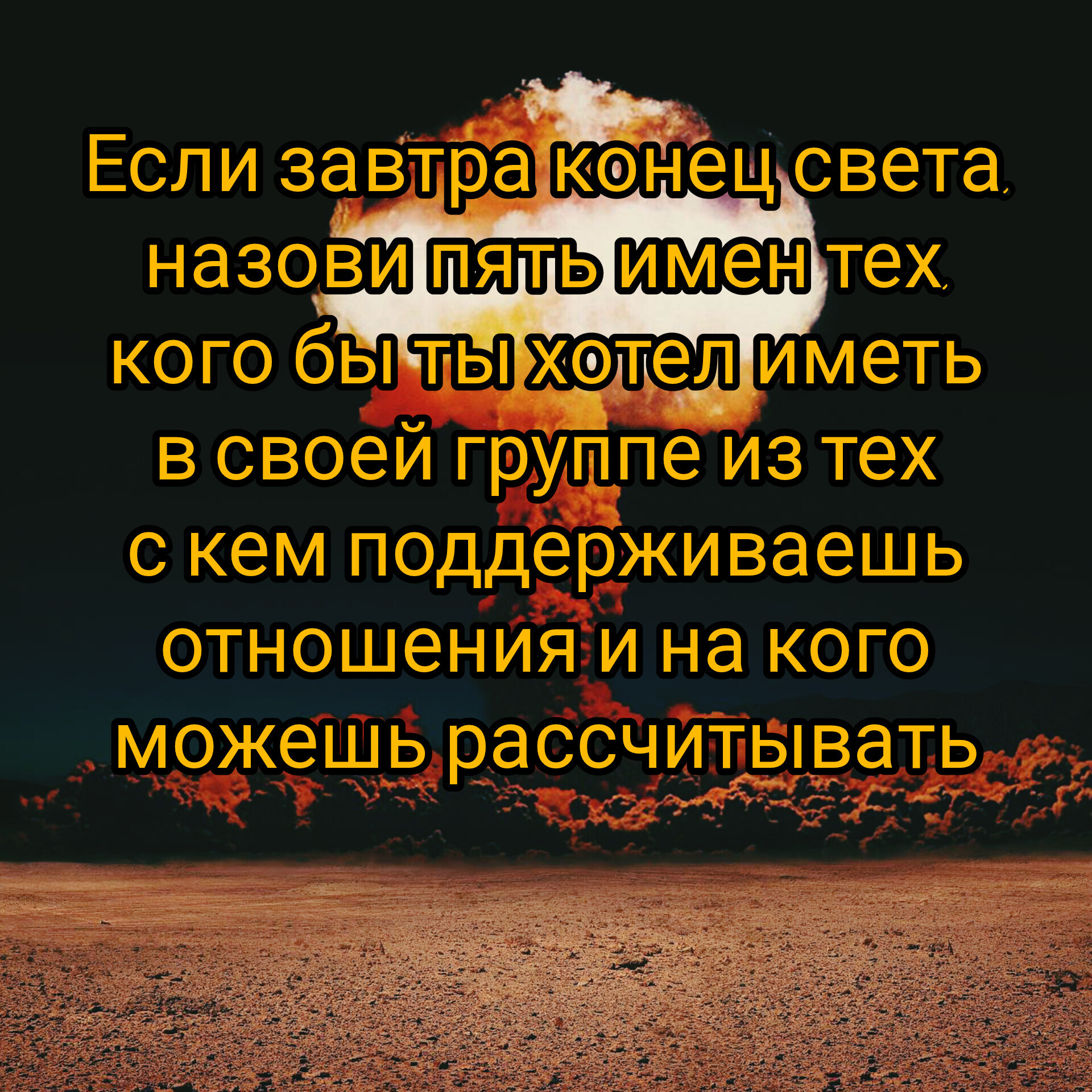 Moravian 14 дней назад Вопрос Напиши в комментариях, только имена. Николай, Сергей, Артём, Илья, Роман. [моё] Вопрос Конец света Ядерное оружие Ядерная война Конец Юмор Готовность Группа Взаимопонимание Дружба Друзья Доверие Война Выживание Борьба за выживание Выживальщики Судный день Терминатор 2: Судный день Помощь 2 Ещё 0