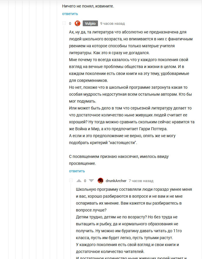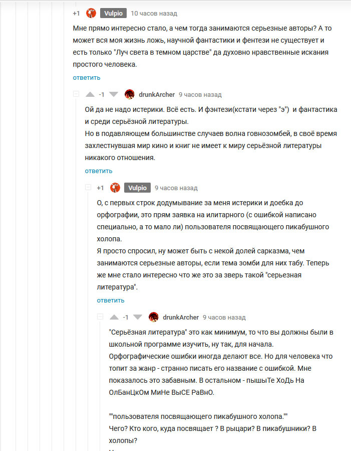 Доброго времени суток уважаемые. В самом неожиданном месте меня настиг сложный спор с пикабушником @drunkArcher на тему того в каком жанре должен работать автор "настоящей литературы" и есть ли такое понятие вообще. Не откажите в любезности с ней ознакомится, может быть поддержать какую то из сторон или даже высказать свое мнение об этом вопросе.