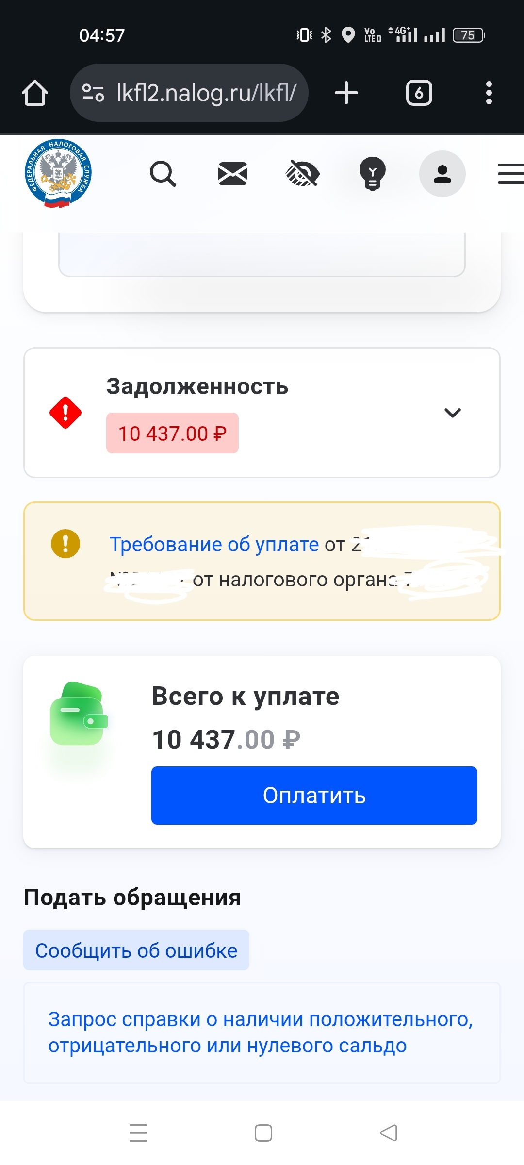 Меня смутило, что за эти два года не было ни слова о задолженности в размере 10 437 рублей. Смущает и задолженность за 2024 год... Показываю, как в приложении "Мой Налог" отображается: