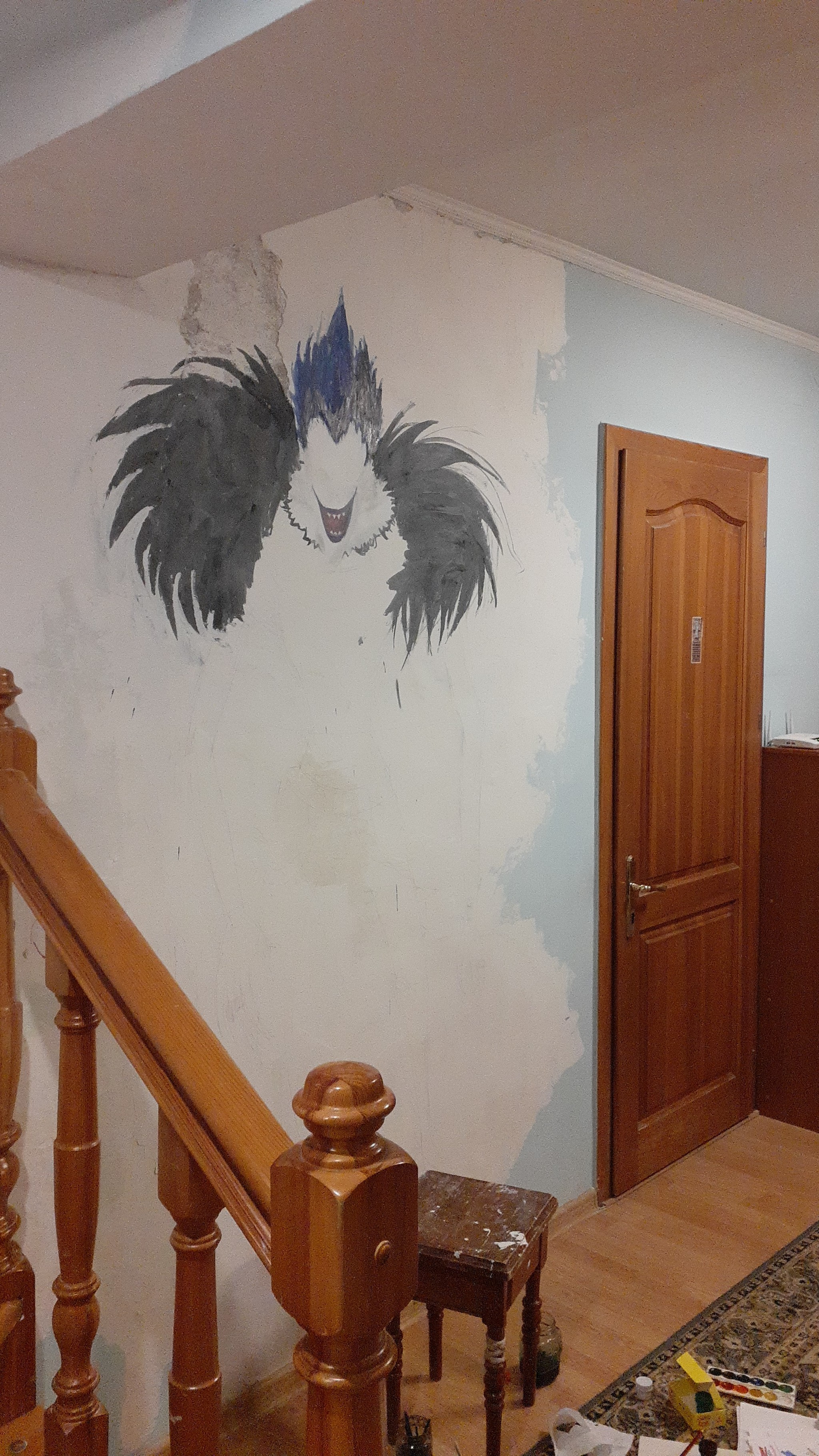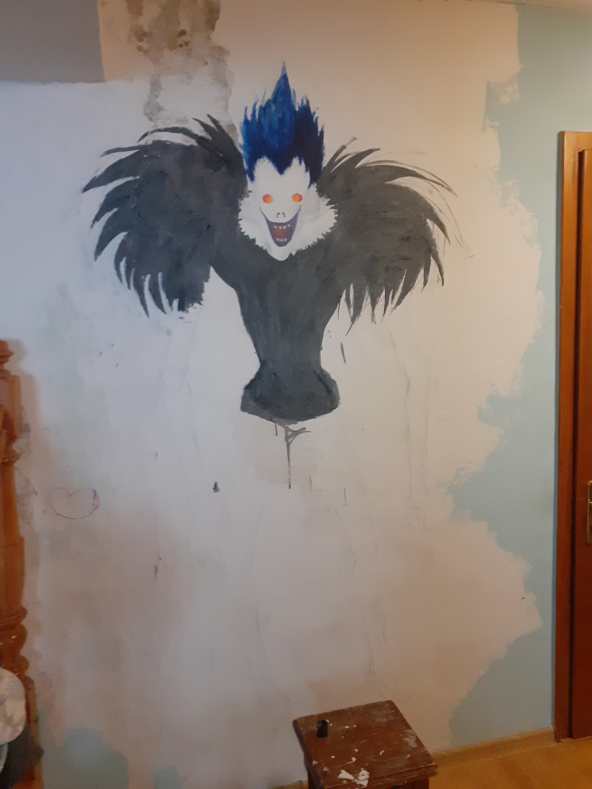 Недавно протекла сантехника (гребанный металлопластик) и испортилась штукатурка на стене. Я, головой вроде нормально работаю, а руками ну прям неочень. Но что-то пошло не так, и голова рассказала "а давай сделай ремонт сам, все равно дома без работы сидишь". В итоге ничего не вышло, я быстро зае...УСТАЛ и вдруг вспомнил, что у меня 12 лет уже есть дочка и она, о совпадение, умеет рисовать. Рисуй, говорю, что-нибудь прикольное. И вот что начало выходить...