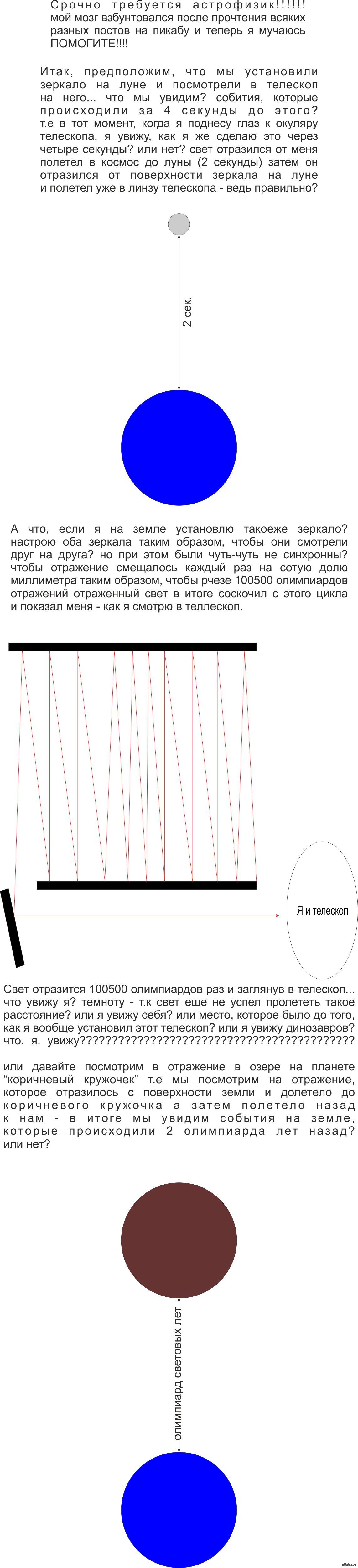 С собственными отражениями - не вполне понятная аналогия, отсюда и путаница. Представь, что на это "лунное зеркало" направлен двойной телескоп: в один окуляр ты смотришь, а в другой светишь фонариком. Тогда да, свет от фонарика ты увидишь с задержкой в несколько секунд. То же самое и с экспериментом с олимпиардом отражений: нечему отражаться, пока система не заработает. возможно (откинув все теоретические сложности) ты и увидишь в окуляре что-то, что происходило несколько секунд-часов-дней назад, но ничего, что произошло бы до того момента, как вся система была завершена, т.е. все зеркала встали на свои места и в объектив попал луч света. А вот в последнем случае - все верно (хотя и неосуществимо).