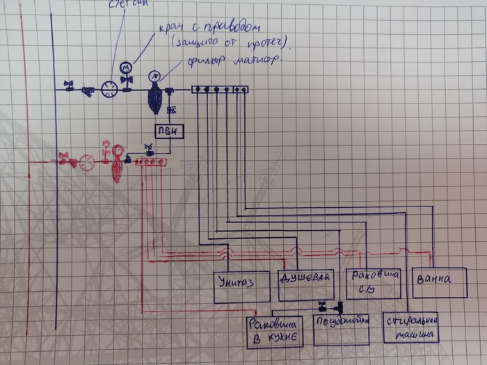 Исходные данные: Санузел 13.8 м2, соответственно место позволяет организовать хороший просторный короб для размещения всех приблуд. Напор очень хороший, но какое давление не знаю. Планируется система защиты от протечек. Проточный водонагреватель (на 2 недели в году), встроенный в разводку. Потребители (стандартный набор): унитаз, душевая, ванна, стиралка, посудомойка, умывальник, мойка в кухне, фильтр питьевой с краном. На входе думаю поставить фильтры для сбора механических загрязнений. После сборки всего этого добра, хочу взять на несколько часов в аренду аппарат для опрессовки и испытать всё повышенным давлением.