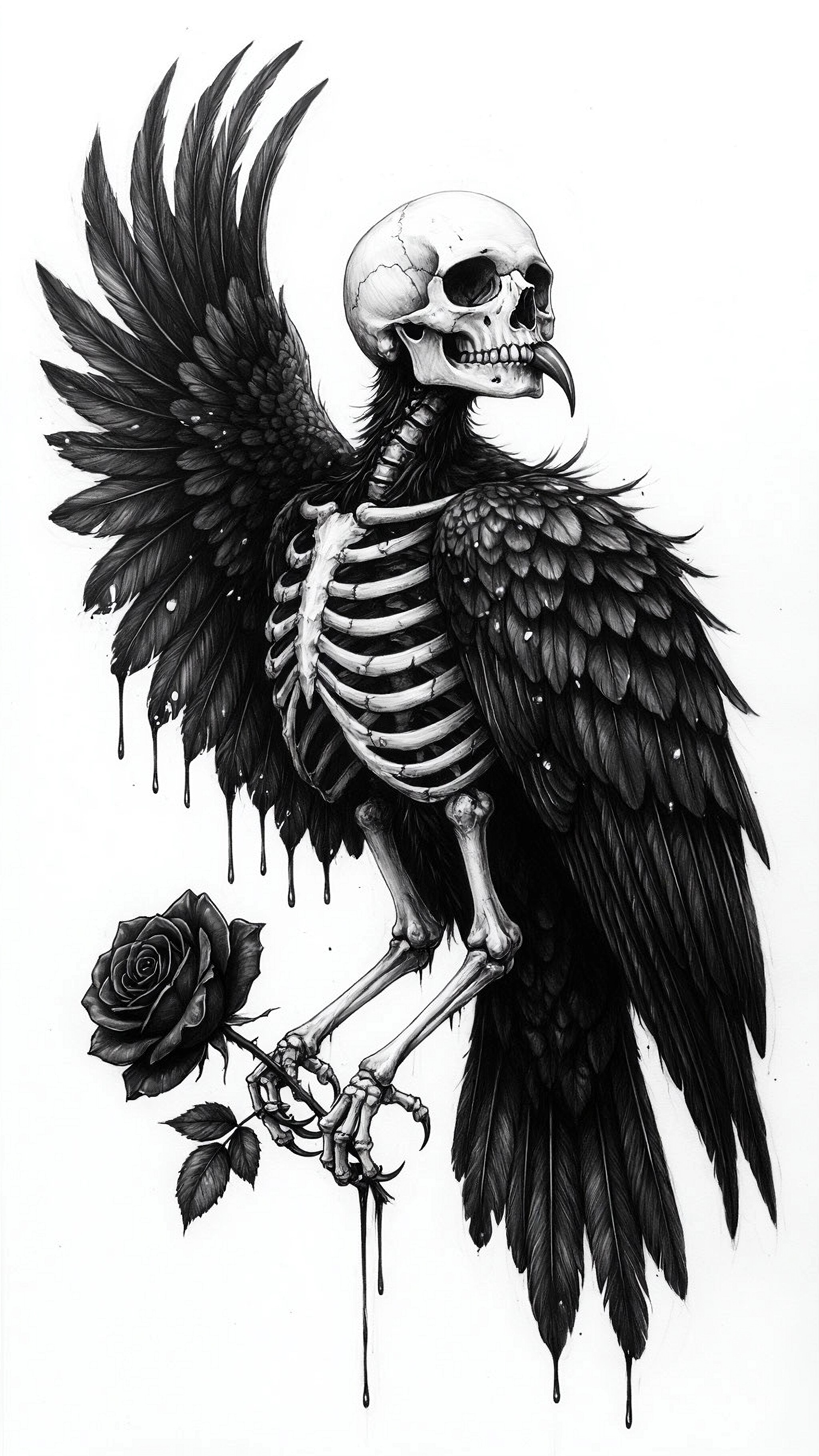 эскиз татуировки, изображающий скелет ворона с черепом в качестве головы. Крылья ворона остаются пернатыми и темными, а тело частично скелетировано. на крыльях и кончиках перьев капли серебра. В одной из лап он держит чёрную розу. Весь рисунок выполнен в готическом стиле, с деталями, создающими мрачную и мистическую атмосферу.