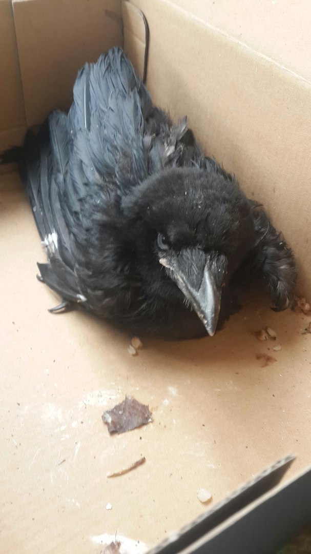 Подобрал под дождем вороненка. Утром видел что выпал и с ним кружили вороны, в обед проходя мимо нашел его одного мокрого и тихо каркающего. Сейчас сидит в коробке и ждет хозяина. Не помешал бы ветеринар - на лапе есть ссадина и одно крыло не прижимает до конца, хотя машет обеими крыльями. Пока покормил гречкой. Нет времени содержать ворона. Тут недавно все восхищались дрессированным вороном, может кто хочет себе?
