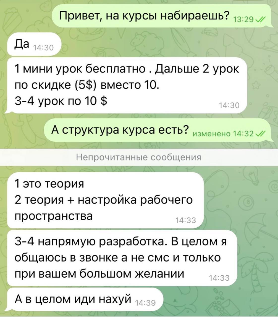 6 Nak20 Лига фрилансеров Воронка продаж убила 2 месяца назад Парень нашел в соцсетях выгоревшего айтишника, который предлагал пройти за деньги обучающие курсы. Юмор Диалог Мат 5 2 Ещё 0