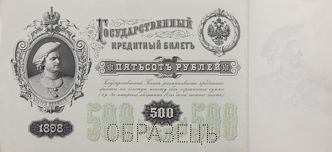 Впервые в России на государственных ценных бумагах изображение Петра I, выполненное с памятника М. Антокольского, появилось в 1898 году. Это была, как и сегодня, купюра в 500 рублей: