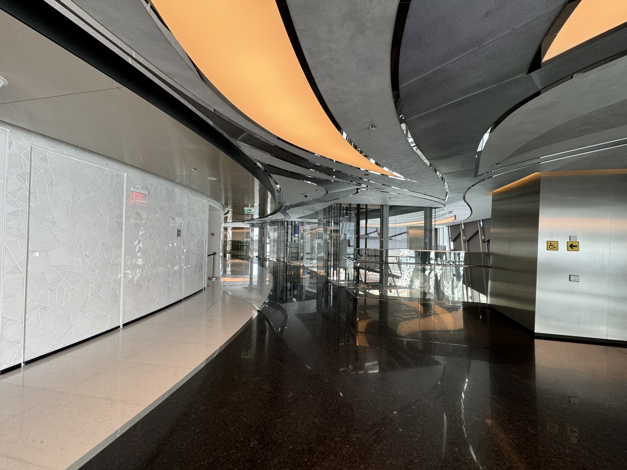 Лифты: 40 скоростных кабин, некоторые из которых мчат вверх со скоростью 8 м/с (как падение в обратную сторону).