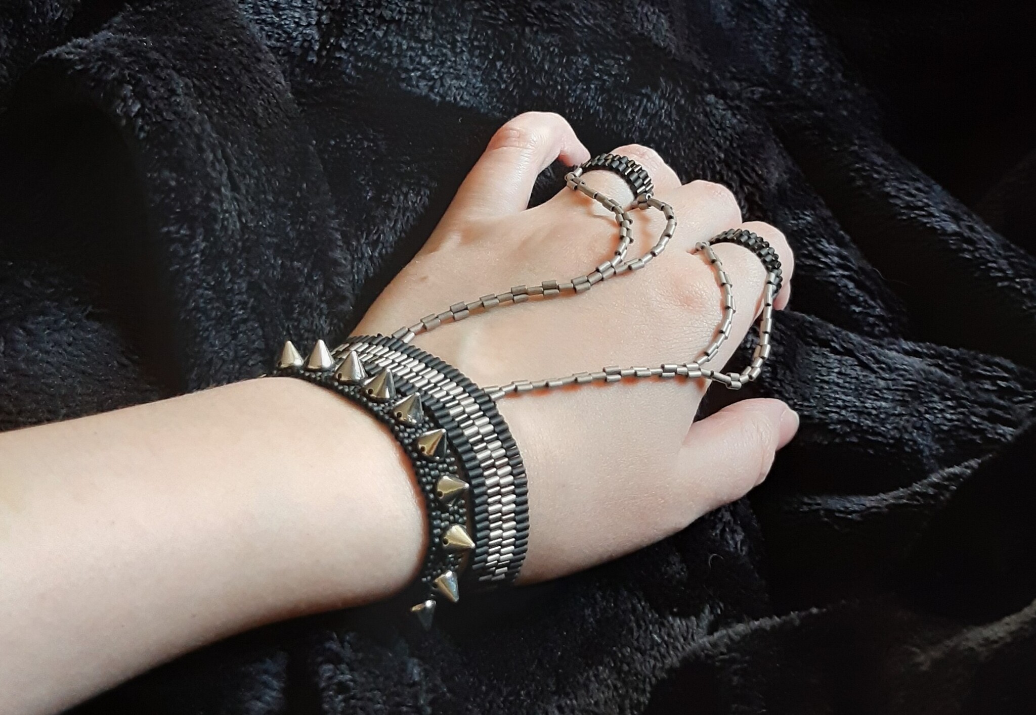 Плела в 2012 году. Их почти сразу купили на какой-то из ярмарок, нормальной парной фотки так и не сделала, только вот это, на коленке. Отголоски готично-неформальной юности)