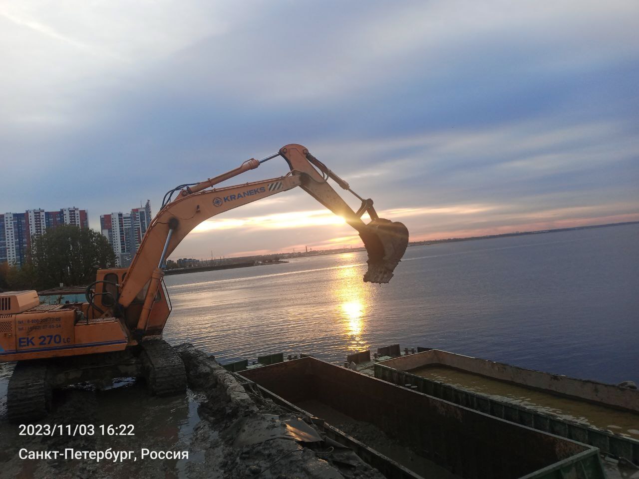 Суть работы следующая. Некая фирма занимается дноуглублением в СПБ. Вынутый грунт грузится в баржи, затем подгоняют его к нам на причал, мы его выгружаем. Так создаётся искусственный полуостров, как в Дубаях ваших, небось лет через 20 туда ещё и высотки впендюрят.