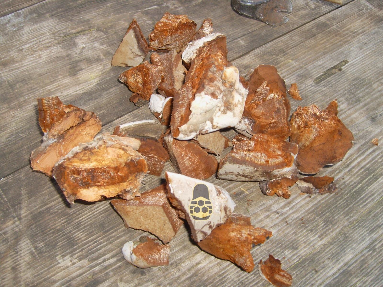 После того как найден гриб, его ещё нужно отломать от дерева, а потом нарубить на маленькие кусочки, чтобы он быстрее высох и поместился в дымарь.