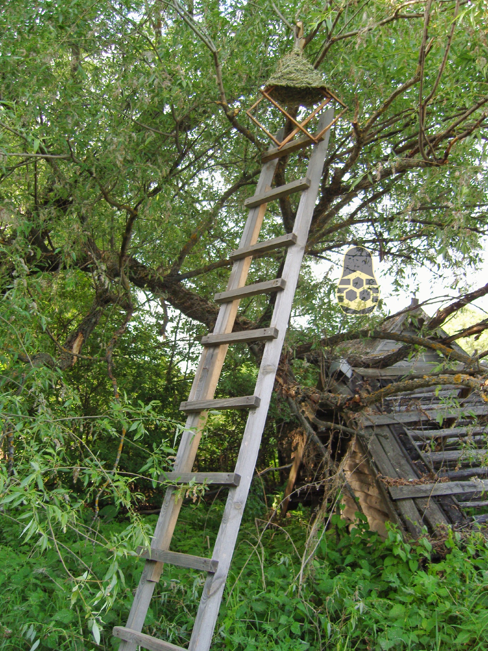 Когда приходиться лезть высоко на дерево, хочется, чтобы пчёлы не разлетались, а падали аккуратно в ловушку и безопасно можно было её спустить.