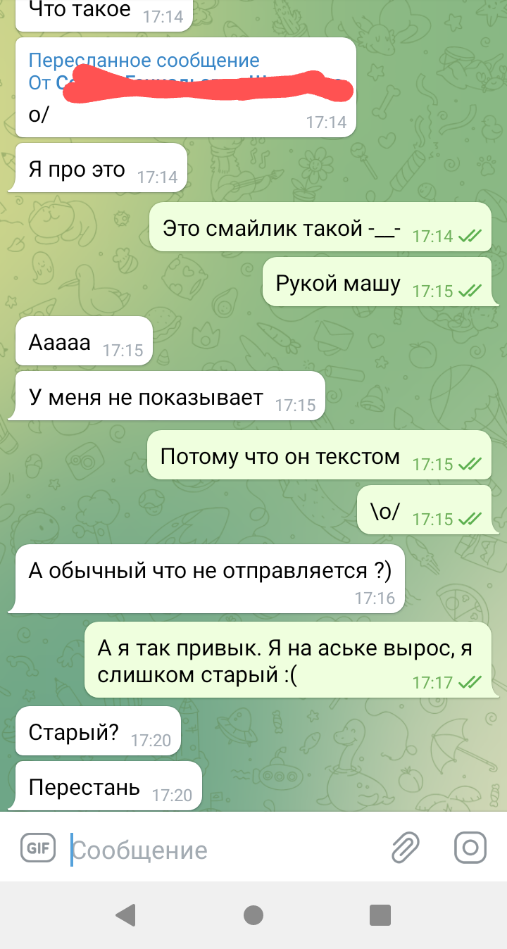 7945 Liveform Общение Восприятие текстовых смайлов 4 года назад Общение не задалось :( [моё] Telegram Переписка Знакомства Длиннопост Скриншот 98 14 3 3 2 Ещё 0