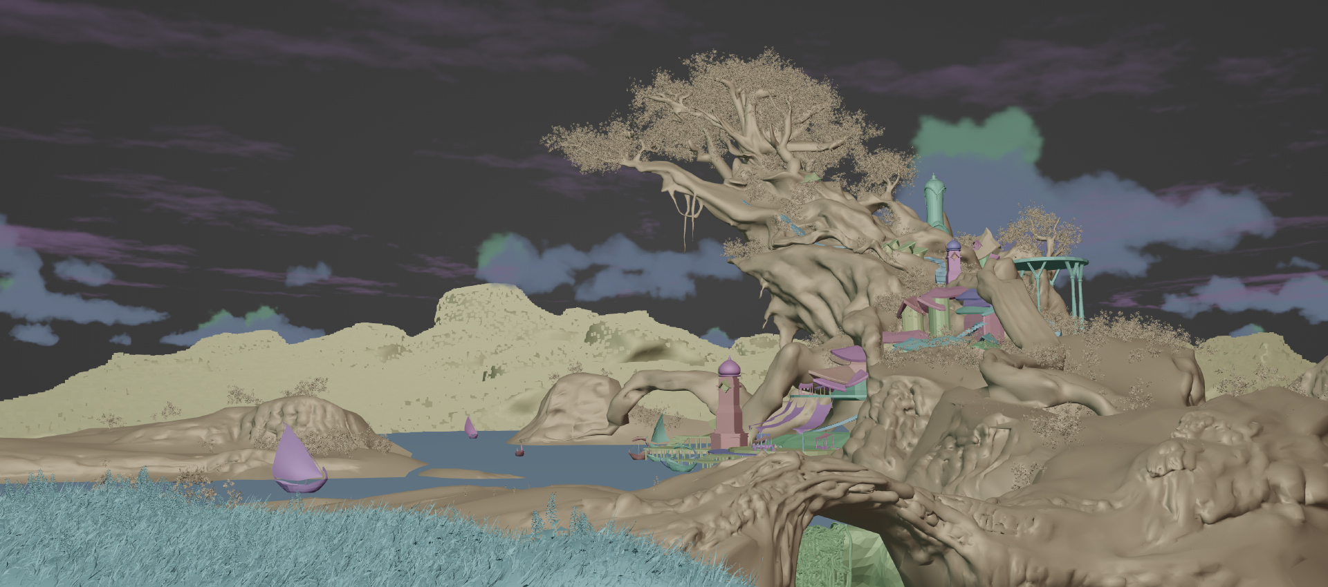 Для начала я создал 3д основу в Блендере. С помощью скульптинга я сделал ландшафт, затем замоделил порт, лодочки, башни и очень ленивые домики. Также я сделал лоуполи деревья и траву и рассеял их по ландшафту используя Геометри Ноды.