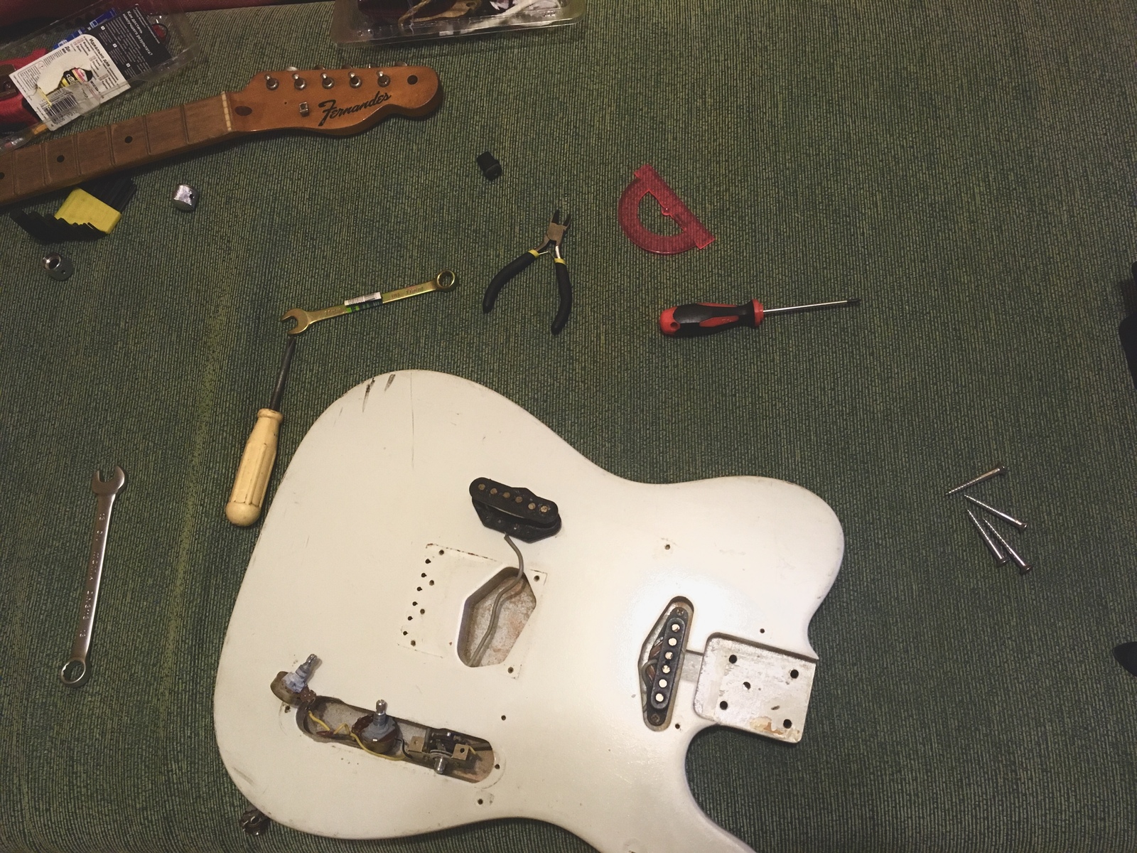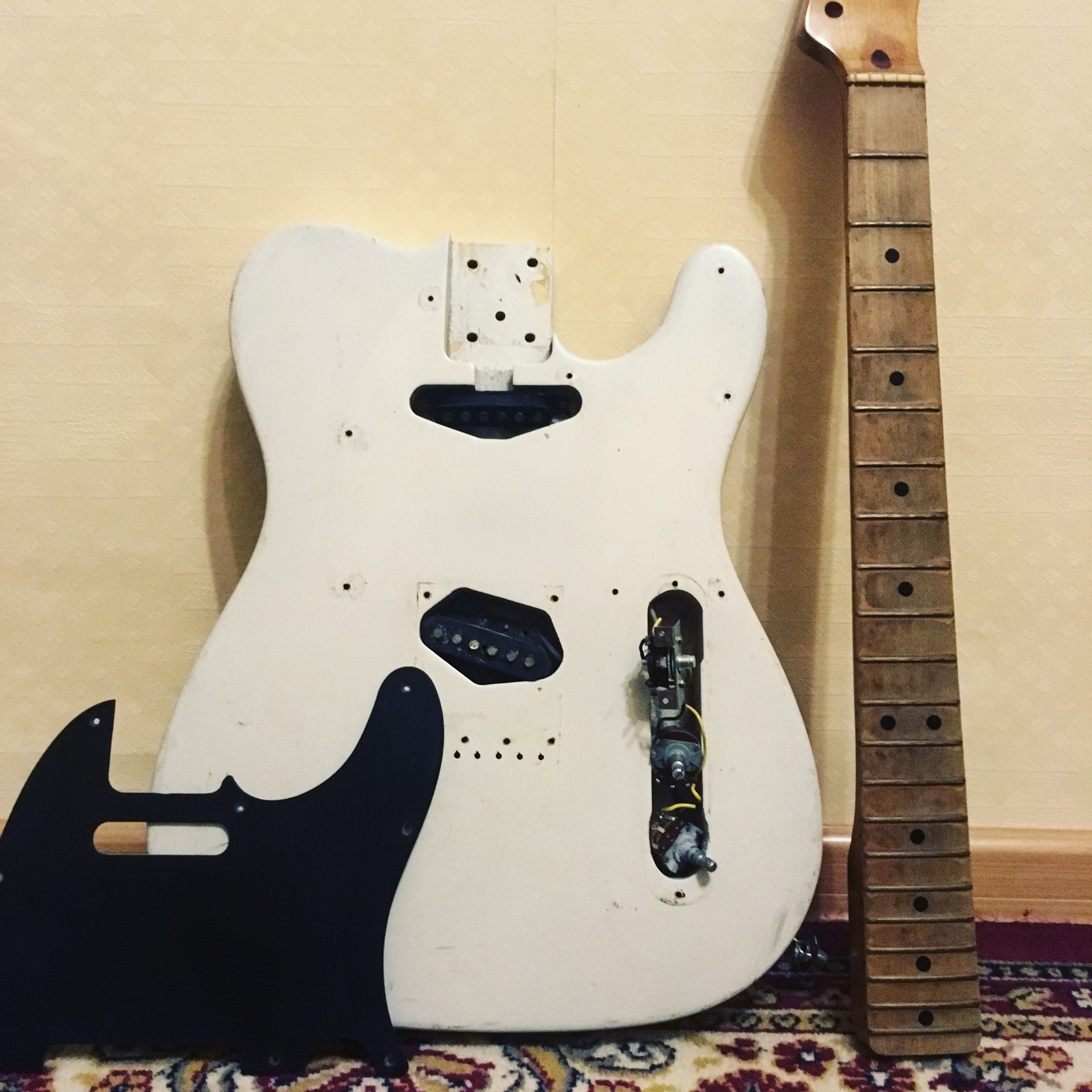 При беглом осмотре было выявлено, что кроме ржавчины на всей фурнитуре, потертостей и вмятин на корпусе, а также туго работающих колков, проблем нет. Но как оказалось это только на первый взгляд, о "скрытой угрозе" пойдет речь в следующем посте. После пробы звука, который на мое субъективное мнение именно тот, который и нужен для телекастера, был составлен небольшой план работ: