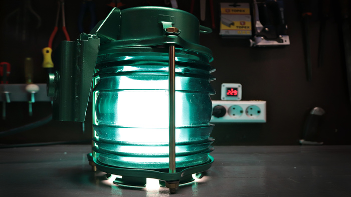 Старый морской фонарь, лежавший в кладовке более 30 лет, наконец-то дождался своего часа. До того как уйти на покой в кладовку фонарь , судя по его внешнему виду , повидал многое, одно можно сказать точно - красили его часто, хотя и не всегда хорошо, поэтому местами, где краска не облупилась, её слои достигали впечатляющих толщин. В местах, от краски свободных, металл поеден ржавчиной, провод питания частично поеден крысами. Самое неприятное - сколы на стеклянной колбе, единственный момент, который я не знал как устранить (если вы вдруг знаете способ, делитесь смело). А так в целом вполне себе живой фонарик, даже лампа накаливания целая была!