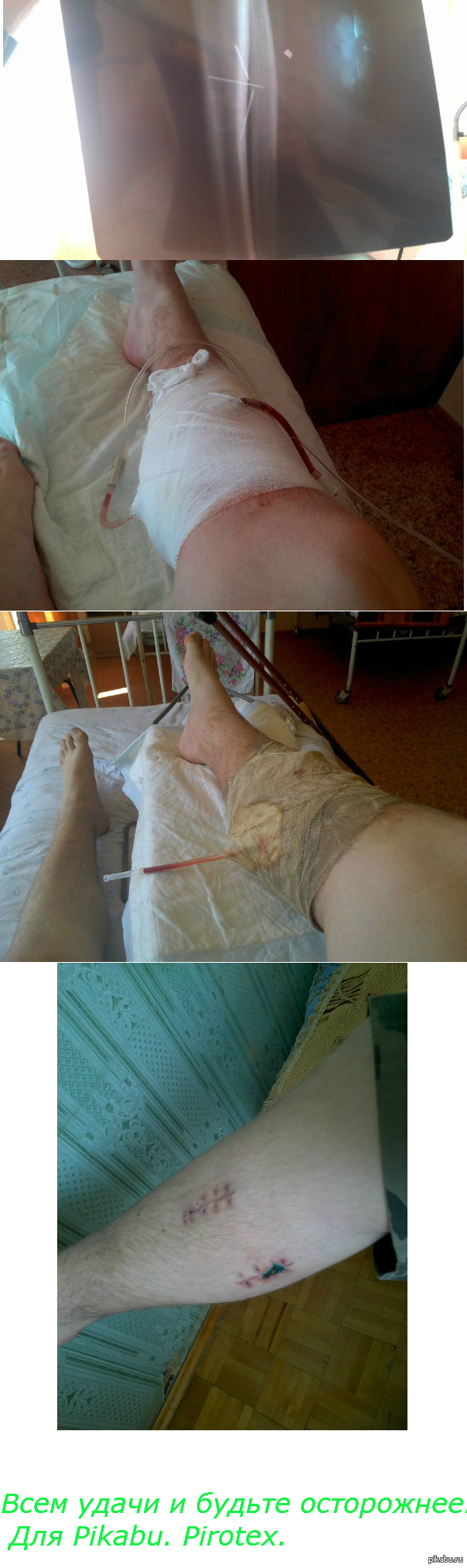 Возможно, у многих из вас есть пневматическое оружие (пистолет, винтовка). Многие, да наверное все, стреляли по банкам и бутылкам, а кто-то и ворон стреляет. И, наверняка, каждый думал о том, что будет, если выстрелить своему другу или соседу в мягкое место=) К сожалению, я попробовал это на себе. А теперь описание. Моя винтовка-обычная отечественная МР-512, которую я усилил и разогнал до ~220 метров в секунду. Пулька-0.68 грамма. Это около 16,5 дж энергии. В модификацию входил мягкий спуск, от которого я и пострадал. Однажды ходил в ближайшие поля (я живу на самом краю города) и там стрелял по банкам. Плюнув на ТБ (технику безопасности. Подумал, что за один раз ничего не случится) поставил заряженную винтовку вертикально, оперев на дерево, и пошёл ставить мишень. Естественно, винтовка соскользнула, упала, ударилась обо что-то твёрдое и выстрелила (мягкий спуск становится крайне капризным). Пуля попала в икру правой ноги, расстояние метра 3. Первые впечатления..."БЛ*ТЬ!!"Боли почти не было, т.к. сработал шок. Входное отверстие небольшое, но широкое, так как пулька была тупоголовая. Кровь шла медленно, но остановить так и не удалось. Благо в сумке были платки одноразовые. Сделал импровизированную повязку, закрепил ремнём и потопал домой. Сначала идти было нормально, но минут через 5 появилось чувство, как будто мышцу свело, но без боли (деревянная, толком не двигается). Потом приехал в больницу, там в приёмном покое сделали снимок, направили на операцию. Оперировали долго (часа 3), от общего наркоза отказался. Пульку не могли долго найти, разрезали мышцу, потом резали вдоль кости (верхний шов), 2 снимка в приёмном покое и 6 на операции. В конце повезли на ЭОП (что-то вроде рентгена, но очень быстро и часто снимает) там и вытащили. Поставили дренажные трубки. Через них прогоняли физраствор с антисептиком. Но инфекция всё равно попала, так что в больничке пролежал 7 дней, мой зад выдержал атаку курса 2х антибиотиков) 4 укола в день.Под местным наркозом было ОЧЕНЬ больно резать, видимо на меня плохо действовал. Ещё около 3х недель я не мог встать на ступню полностью и не мог полностью разгибать\сгибать ногу в колене. Сейчас вроде всё хорошо, но ступня имеет чуть меньшую подвижность, чем у здоровой ноги. Так же иногда простреливает ногу.Всё это случилось в начале мая. Вот такая история. Соблюдайте технику безопасности и берегите себя =)