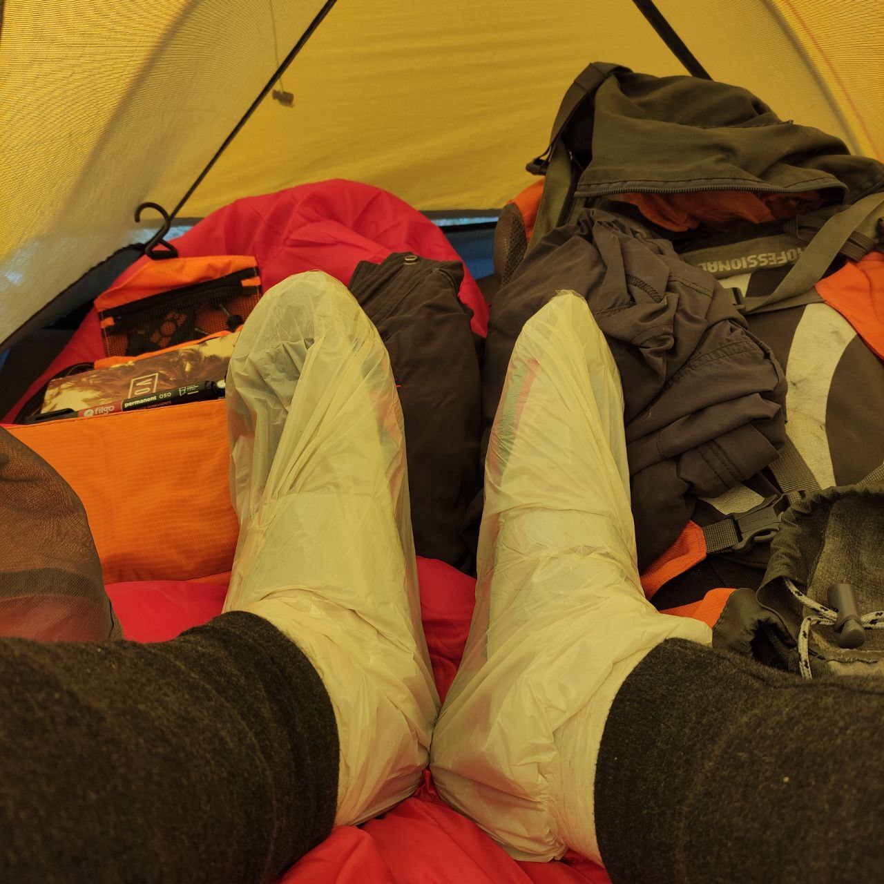 Дождь и не думал прекращаться и я решил перестать это терпеть. Нет, не бросить все и сидеть в палатке, а апгрейднуть мою обувь: два пакета, скотч на месте трения, несколько отверстий - отлично. Не кроссовки, конечно, но в дождь будет куда комфортнее.