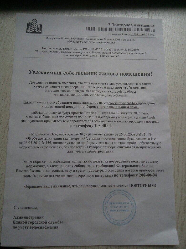 Сегодня пришел домой и обнаружил в почтовом ящике вот такое объявление, где говорится, что необходимо провести метрологическую поверку счетчиков. Сразу бросилась в глаза печать, по которой видно, что она напечатана на обычном цветном принтере. Тема, в принципе, не нова, но лох, как говорится, не мамонт. На деле, предлагают не провести поверку счетчиков, а сразу заменить их на новые, ибо, по словам оператора, старые счетчики поверку не проходят. Жильцы моего дома, в основном, пожилые люди, видимо, рассчитано, что они испугаются и срочно начнут звонить по телефону, так как в извещении идет акцент на то, что оно уже повторное. Не ведитесь на подобный развод, дамы и господа, а я пойду предупреждать соседей.