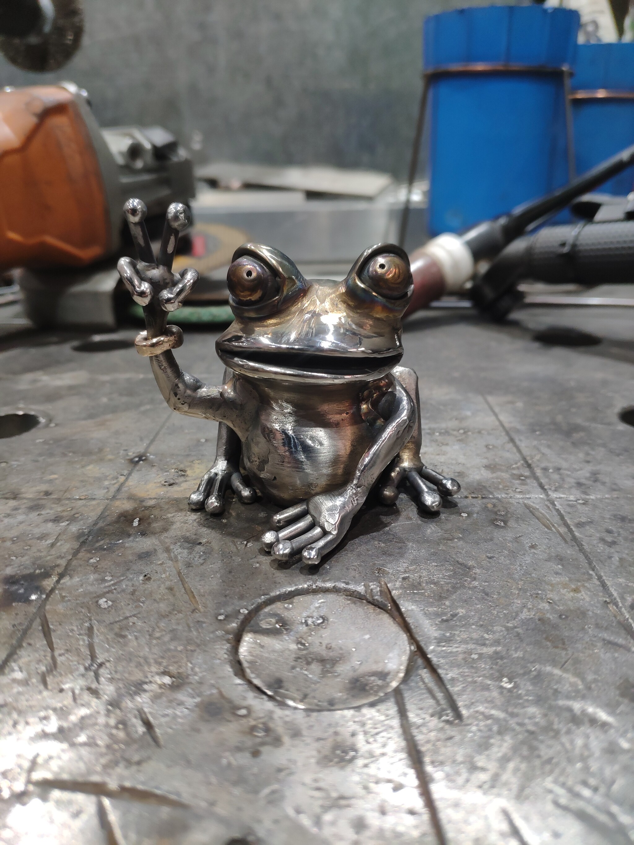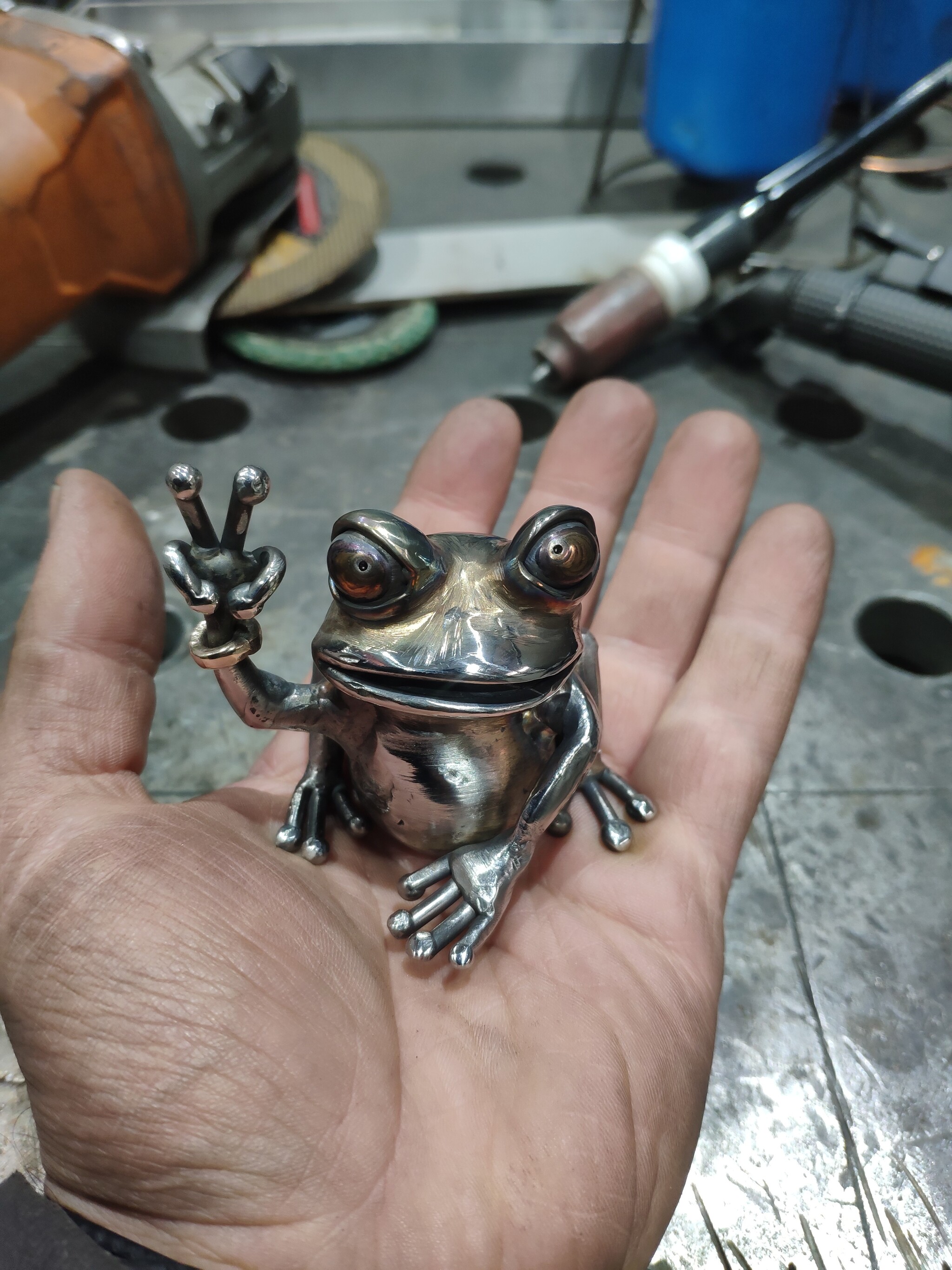 Лягуха из нержавейки, браслетик из бронзы.