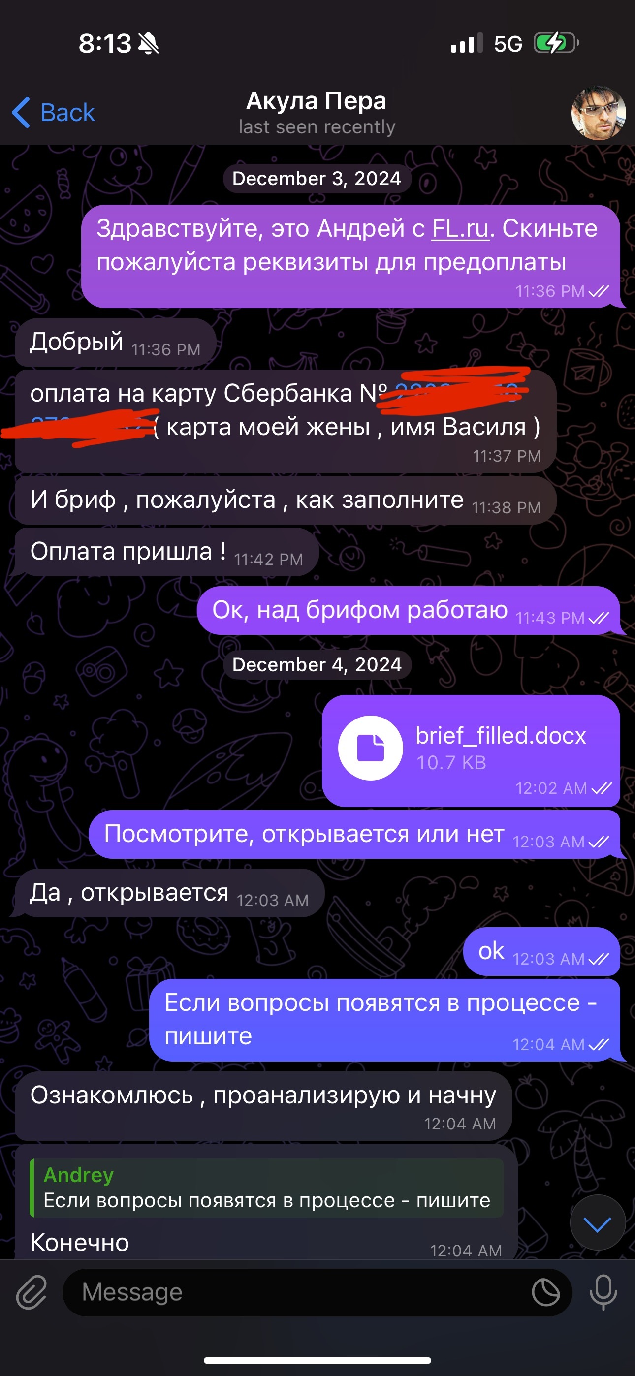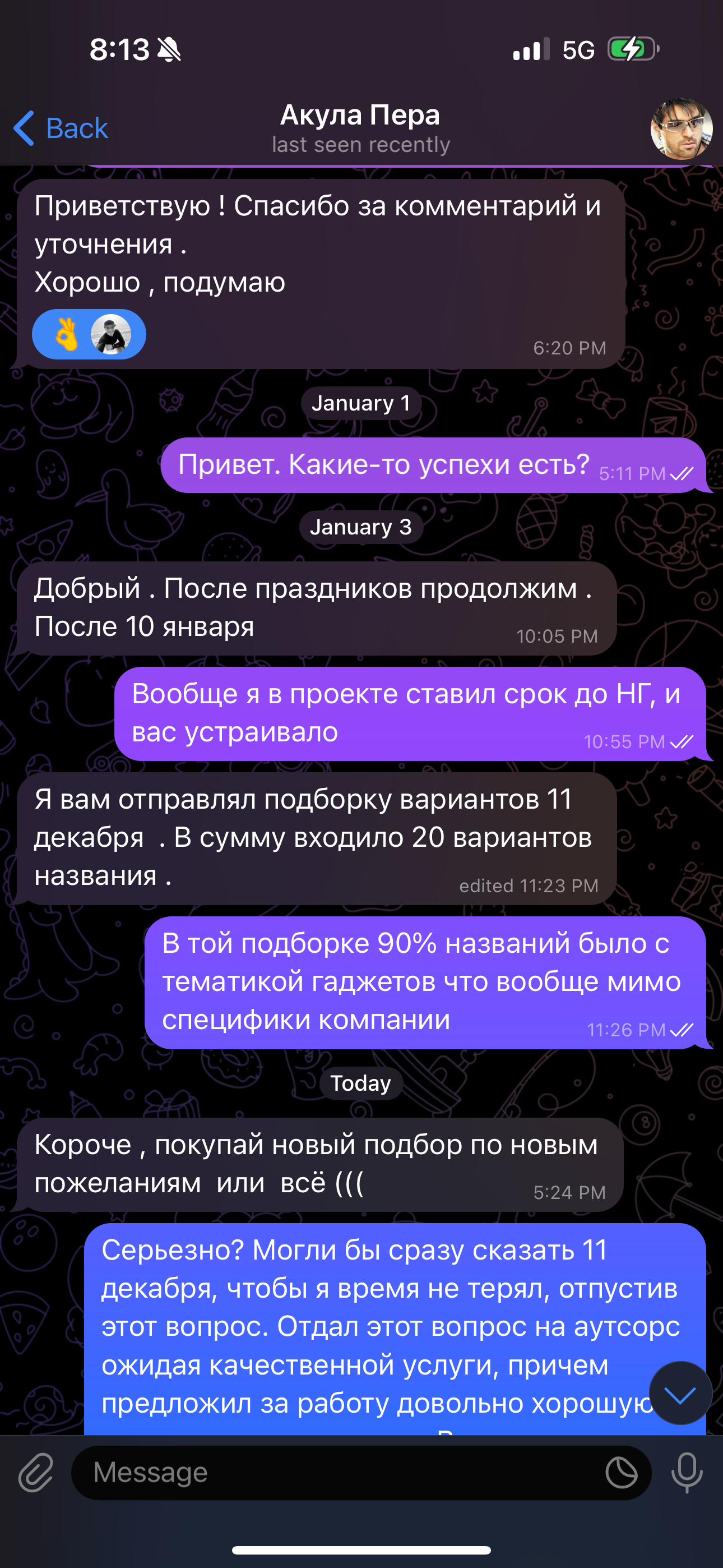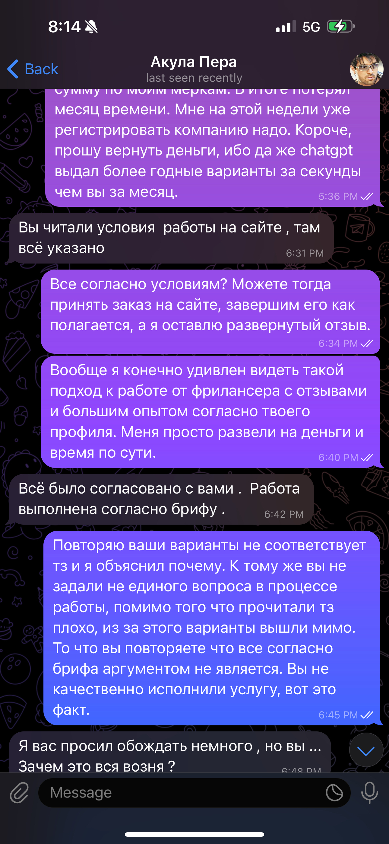 Результат: проходит срок, проходит нг, первые числа, я пишу ему, есть ли новости? Отвечает «продолжим работу после праздников, после 10-го». Меня естественно это не устраивает. Дальше он переобувается и говорит я вам варианты предоставил за них и было уплачено. Все мои аргументы о том что варианты не соответствуют тз никак не воспринялись.