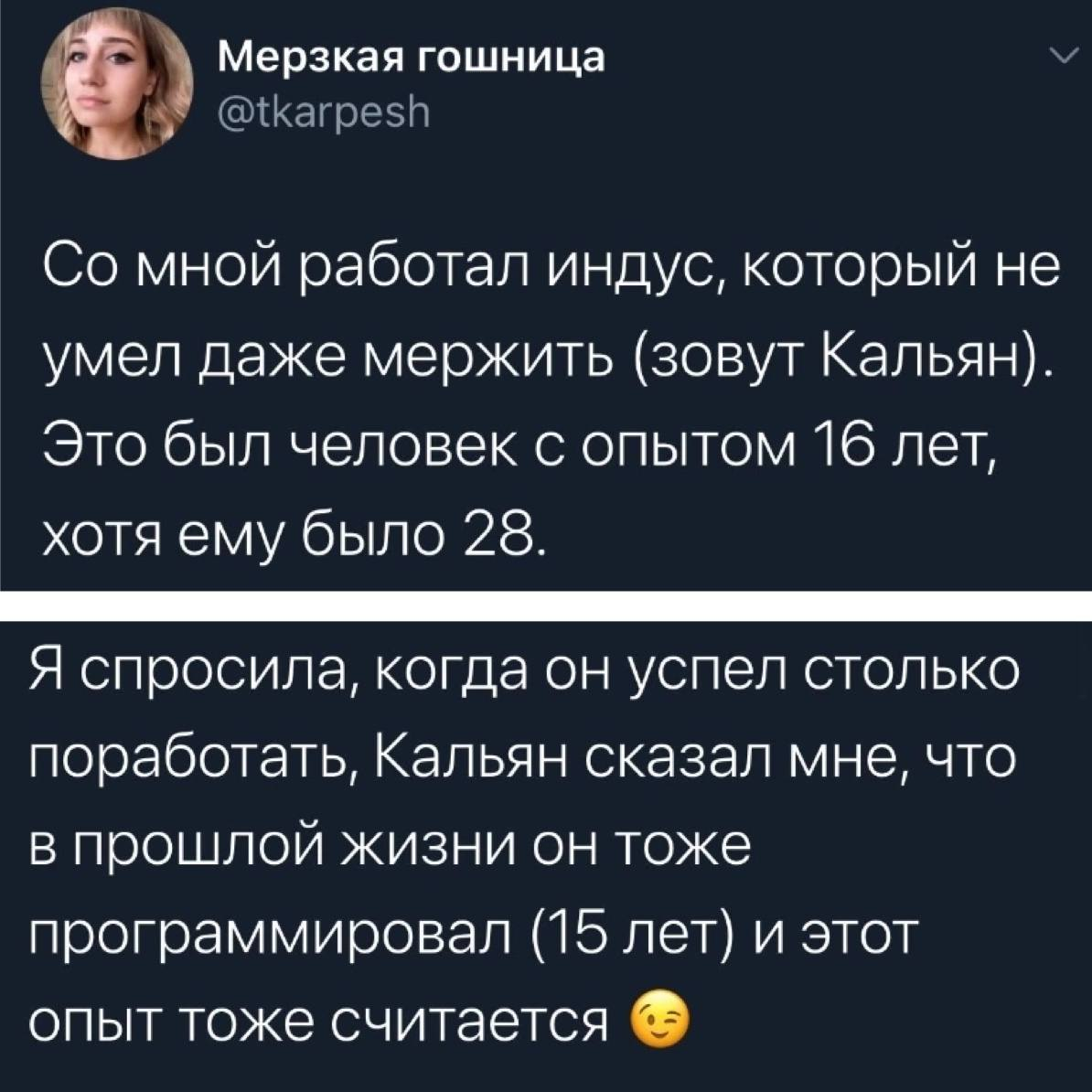 4559 DaSeryozno IT-юмор Юмор Вот про какой опыт в вакансиях пишут1 3 года назад Позаимствовано отсюда Юмор X (Twitter) Скриншот Индусы Реинкарнация Стаж Повтор 58 4 Ещё 0