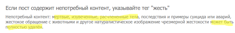 Нет, действия я не понимаю. @moderator, cудя по пункту правил (особенно если читать его целиком, а не рецензионно), данный пункт не запрещает, а регламентирует "жесть-контент". Приписка же лишь позволяет дополнительно регулировать спорные моменты. В нашем же случае ангажированный или же просто не понимающий правила модератор удалил пост по собственному желанию, т.к. даже жалоб на пост не было.
