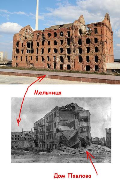 Внимательнее читай. Я написал, что на чб фото на фоне слева находится здание мельницы, а на первом плане тот самый дом Павлова. И здание мельницы на чб и на цветном фото это одно и тоже здание.